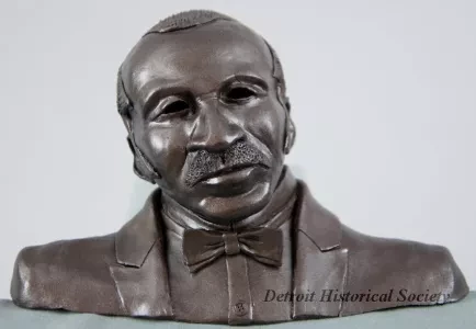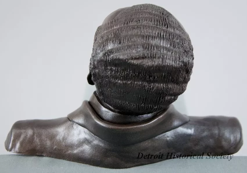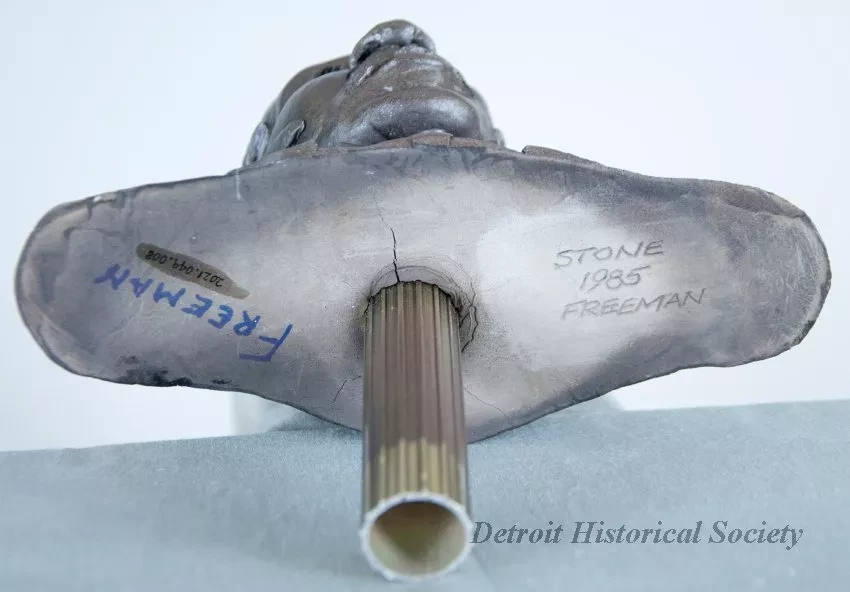 One small plaster bust of Paul Freeman, who was the Youth Orchestra director of the Detroit Symphony Orchestra from 1970 to 1979. The bust shows a head and shoulders, front view of the subject as a middle-aged, African-American man. He is wearing a tuxedo shirt with a bowtie and jacket. The bust is finished with a spray enamel metallic bronze paint. The sculptor, Joel Stone, has inscribed his name, "Stone, 1985, Freeman," on the underside of the bust which is mounted on a vertical 1-inch diameter aluminum tube handle that has a bronze finish. Adjacent handwritten pen text shows the name, "Freeman."