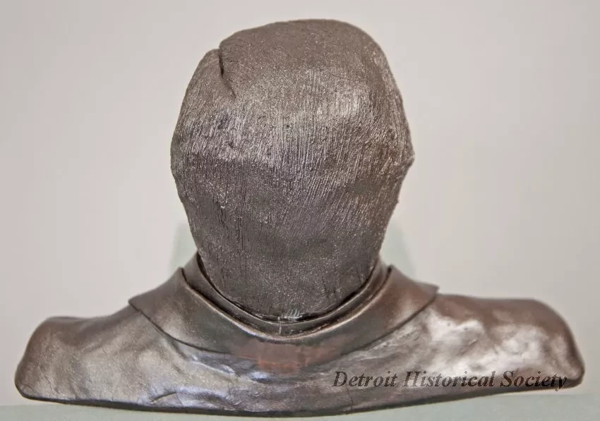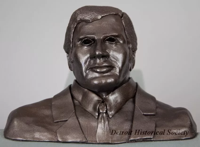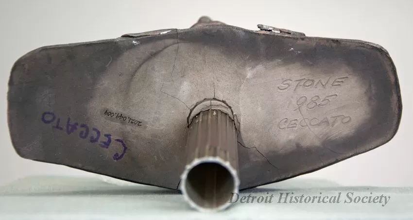 One small plaster bust of Aldo Ceccato, who was the music director of the Detroit Symphony Orchestra from 1973 to 1977. The bust shows a head and shoulders, front view of the subject as a middle-aged man. He is wearing a shirt, a tie, and a suit jacket. The bust is finished with a spray enamel metallic bronze paint. The sculptor, Joel Stone, has inscribed his name, "Stone, 1985, Ceccato," on the underside of the bust which is mounted on a vertical 1-inch diameter aluminum tube handle that has a bronze finish. Adjacent handwritten pen text shows the name, "Ceccato."