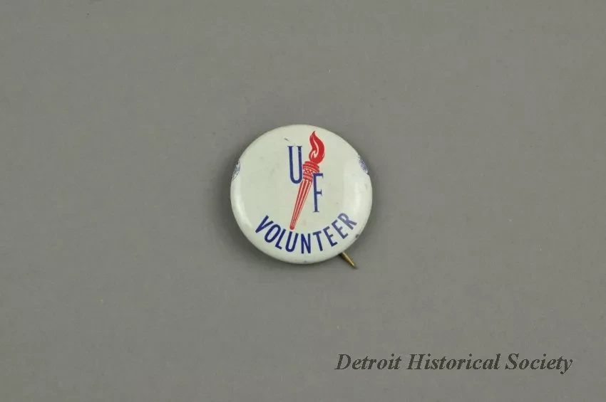 Volunteer button for the United Foundation Torch Drive. The button has a red torch in the center with the U and F on each side. Along the bottom center it states "volunteer".