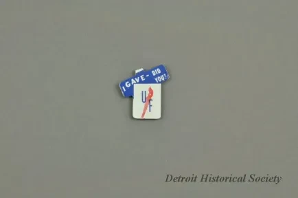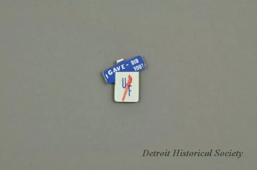 Request ImageSmall United Foundation pin that says "I gave-did you?" A large portion of the pin is the red torch with U and F on each side. The top banner is blue with the text.