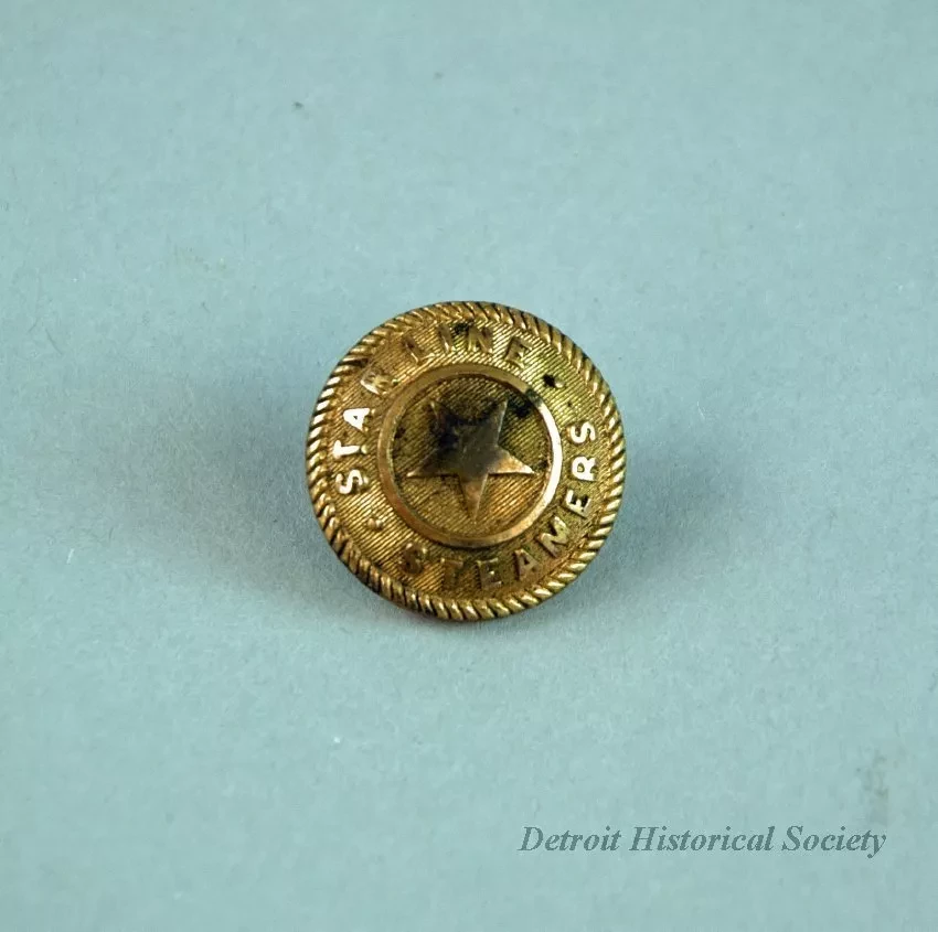 One White Star Line employee uniform button. The brass button has a dome-shaped front with a flat back and a metal eye at the center. The front has a raised star at the center, raised text along the perimeter that reads "Star Line Steamers," and a decorative rope design on the edge. Stamped text on the back of the button shows "Waterbury Button Co."