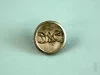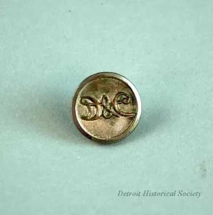 One D&C Lake Lines employee uniform button. The button has a flat nickel-plated brass front with a flat chrome-plated steel back and a steel eye at the center. The front has raised script text at the center that reads "D&C," a background of narrow horizontal lines, and a smooth raised edge. Stamped text on the back of the button shows "Waterbury Button Co., Conn."