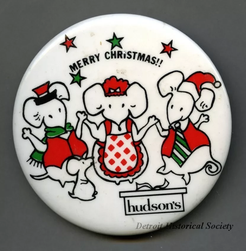 One Hudson's Christmas promotional button. The circular button is made of stamped steel and has a red/green/black/white drawing on the front that depicts three mice dressed in holiday clothing. Adjacent black text reads "Merry Christmas" and "Hudson's." The drawing has a clear plastic covering. The back of the button has an attached pin and a brushed metal finish.