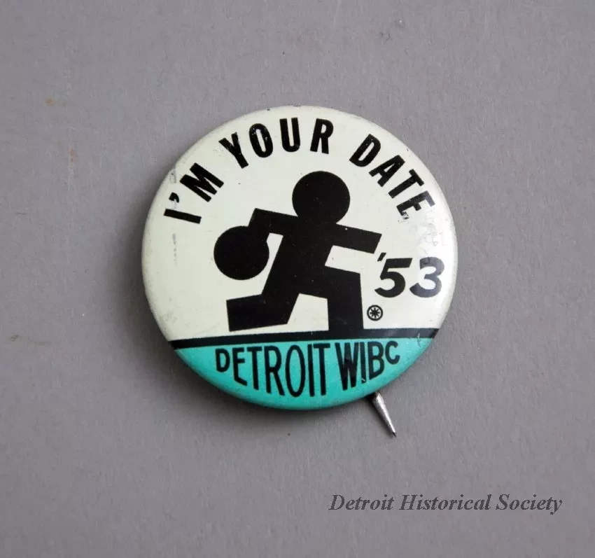 One promotional button for the Women's International Bowling Congress (WIBC). The circular button is made of thin, stamped steel and shows a silhouette image of a bowler on the front with a white/blue background. Black printed text surrounds the image that reads "I'm Your Date, '53," and "Detroit WIBC." The button has a pin on the back and black printed text that reads "The Brunswick-Balke Collender Co."