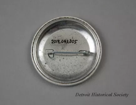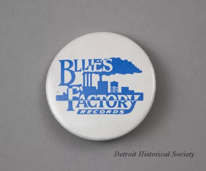 One promotional button for "Blues Factory Records." The circular button is made of metal with a white paper front that is covered with clear plastic. The paper is printed with a blue industrial skyline and text that reads "Blues Factory Records." A spring-type pin is located on the back.