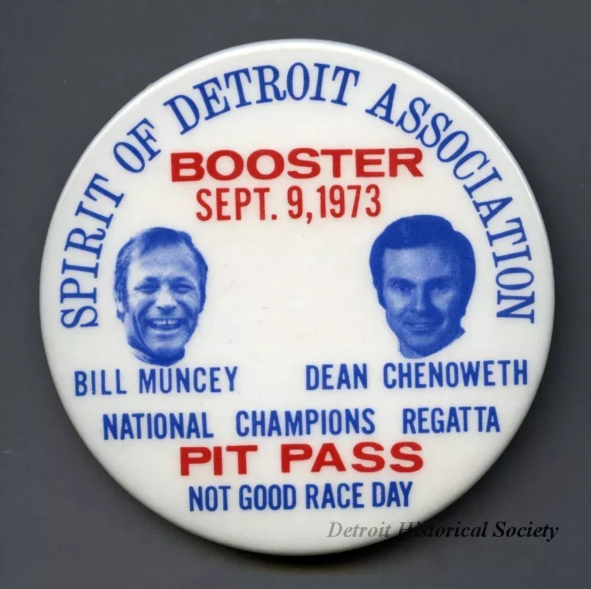 One hydroplane race promotional button that reads "Spirit of Detroit Association, Booster, Sept. 9, 1973," and "National Champions Regatta, Pit Pass." The front of the circular, stamped steel button has red and blue text on white paper that has a clear plastic protective covering. Small blue photographic images show the heads of hydroplane drivers, "Bill Muncey" and "Dean Chenoweth." The back of the button has a gray finish and a pin.