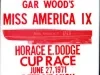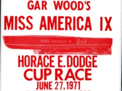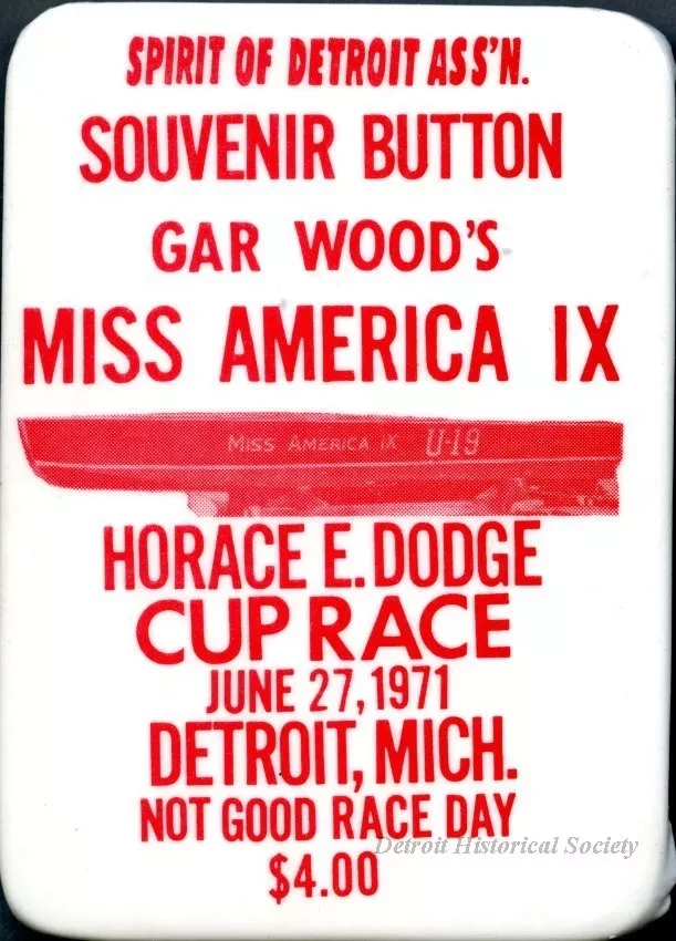 One souvenir button for the Horace E. Dodge Cup Race. The rectangular button is printed in red text on glossy white paper that has been bonded to a metal back. The text reads "Spirit of Detroit Ass'n. Souvenir Button, Gar Wood's Miss America IX, Horace E. Dodge Cup Race; June 27, 1971, Detroit, Mich." and "Not Good Race Day, $4.00." A port side profile view of the "Miss America IX, U-19" hydroplane is shown at the center of the button. The metal back has a safety pin to allow for attachment to clothing.