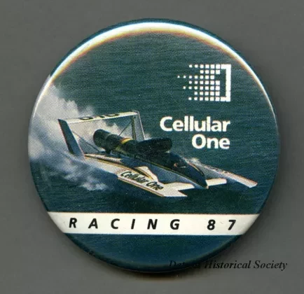 One souvenir button for the "Cellular One" hydroplane. The circular button has an elevated color photographic image of the hydroplane underway on the water. The image is mounted on a metal back that has a safety pin to allow for attachment to clothing. Text along the bottom of the button shows "Racing 1987."