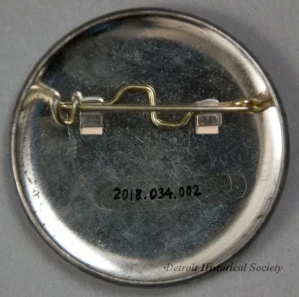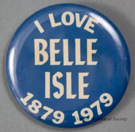 One Belle Isle centennial souvenir button. The circular steel button has a blue paper front with white text that reads "I Love Belle Isle, 1879-1979." The paper has a clear plastic covering. A spring-type pin is attached to the back of the button.