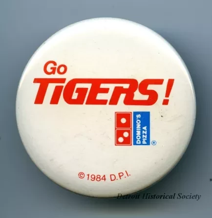 One Detroit Tigers souvenir button. The circular button is made of stamped steel that has a white paper and clear vinyl covering on the front. Red printed text on the paper reads "Go Tigers!" and shows a red/blue Domino's Pizza logo. The back of the button has a large safety pin.