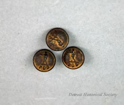 One group of three small buttons from a mail carrier uniform. The dome-shaped buttons are made of brass and have a raised image of a mail carrier who is walking and is holding several pieces of mail in his raised right hand. Raised letters along the bottom of the button show "POD" for Post Office Department. The back of each button has an eye for sewing thread for attachment onto a uniform. Stamped text on the back reads "Pettibone Mfg. Co."