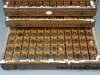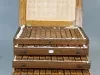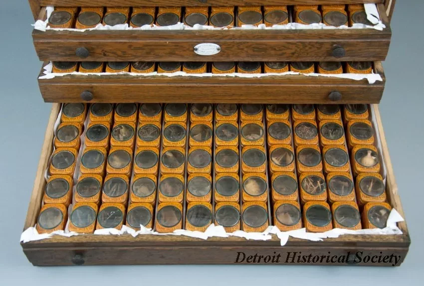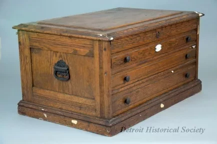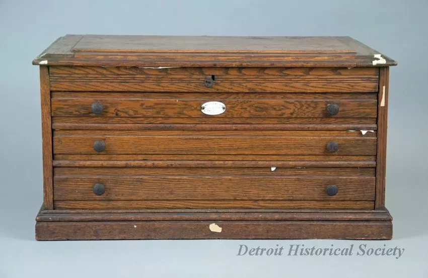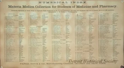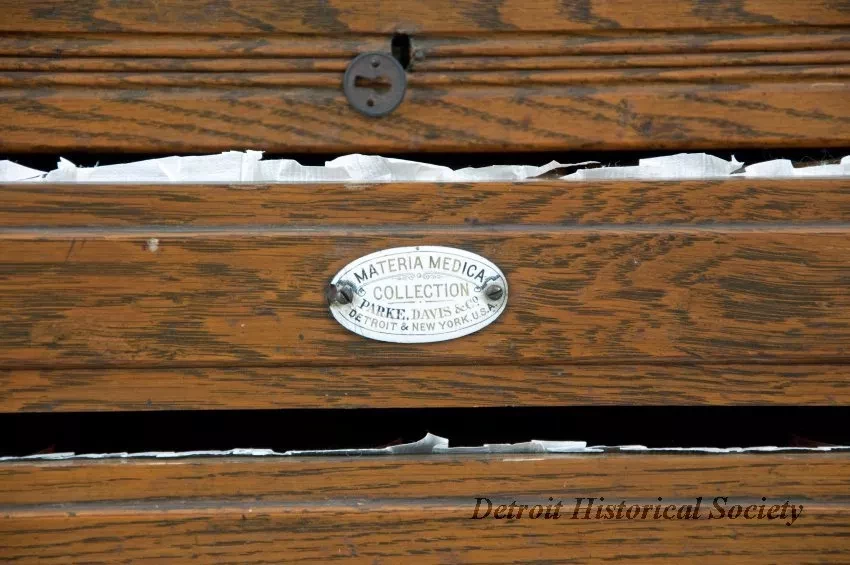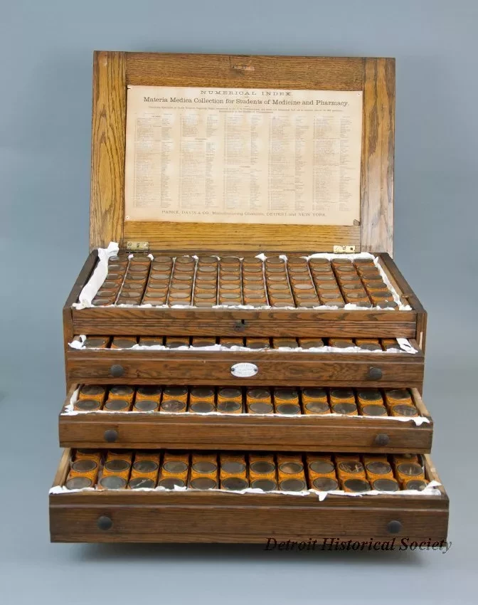 One "Materia Medica" chest. The chest is made of oak wood that has been finished with a light brown stain and a clear lacquer or varnish. It has a hinged top with a routered edge, decorative moldings on the base, handles on the ends, three drawers with knob pulls in front, and a lock for the top. The handles and knobs are made of steel that has been painted black. A brass tab, located under the hinged top at the right front corner of the chest, lifts up approximately 1/2 inch and unlocks the drawers. The drawers contain 288 small metal sample boxes of medicinal plant/herb specimens. A printed cardboard insert on the underside of the hinged top provides a numerical index to the various specimens. A small oval-shaped metal plate on the front of the chest shows "Materia Medica Collection, Parke Davis and Co., Detroit & New York, U.S.A."