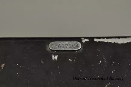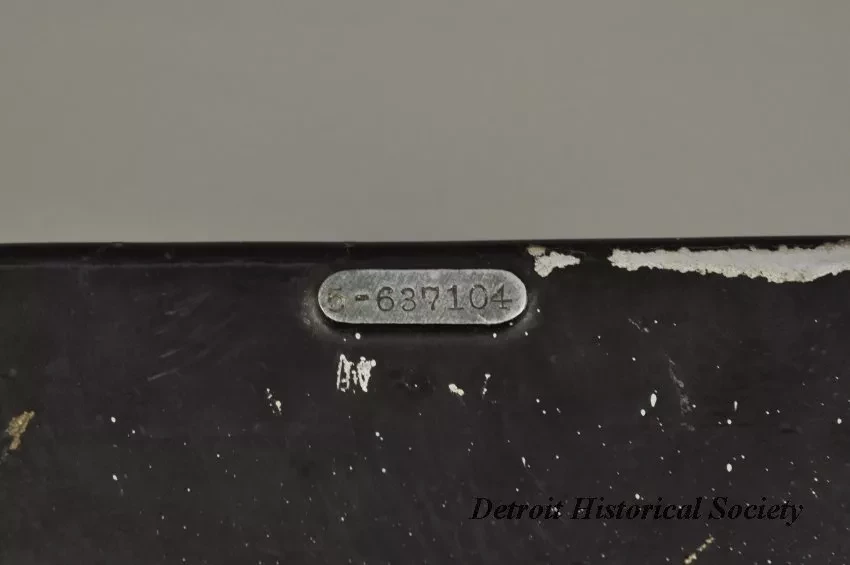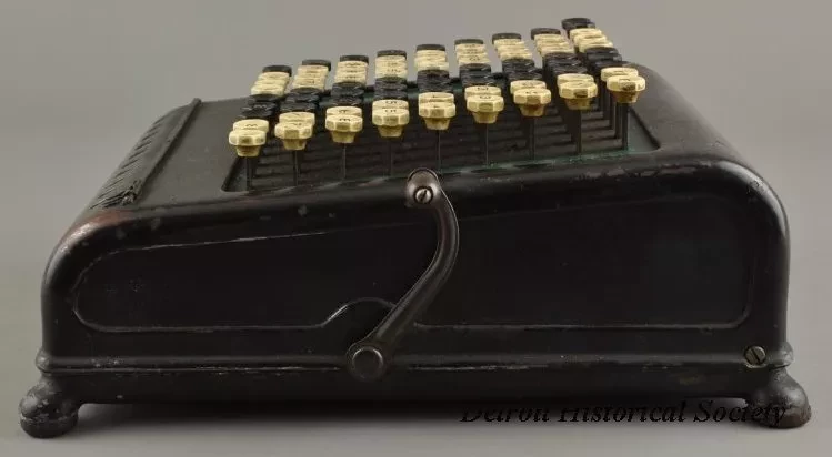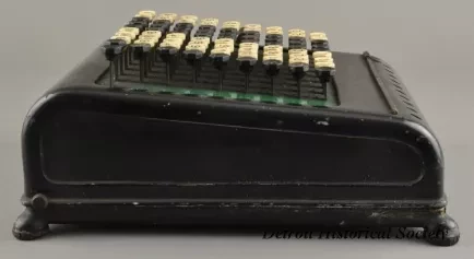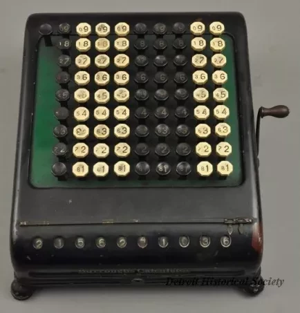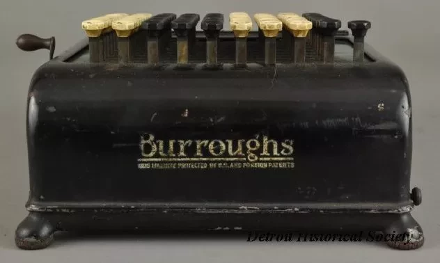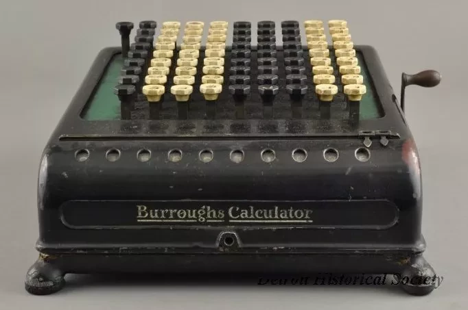 Burroughs calculator. A Burroughs Class 5 calculator with 82 keys, capable of sums of up to ten digits. The body is black-painted metal with a slanted top and a green plate underneath the keys. The keys are each one inch high and are capped with black or off-white plastic numbered keys, arranged in similarly colored columns. Moving from right to left, the keys correspond to different multiples of ten. From the bottom to the top they are the digits 1 to 9. The machine also has a black unlabeled key at the top left corner of its keyboard and a crank on its right side. Below the keyboard is display consisting of ten oval shaped windows behind which are numbered drums. Above the display is a bar supporting two sliding arrow-shaped markers. "Burroughs Calculator" is painted in gold on the front, and "Burroughs, this machine is protected by U.S. and foreign patents" is on its rear. It's supported upon four small feet with rubber bottoms. "5-637104" stamped on small metal tag on underside.