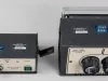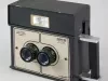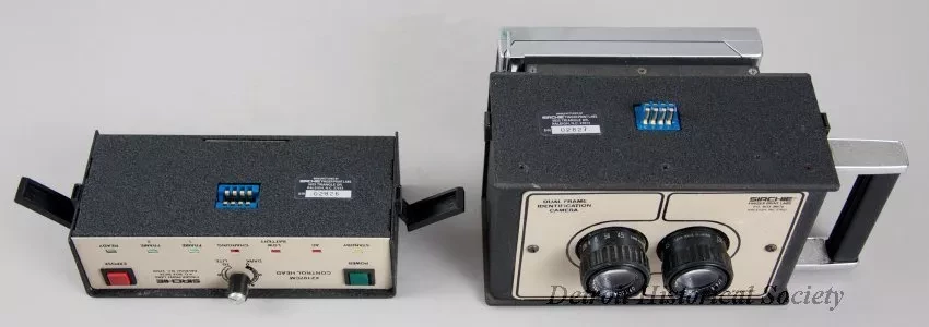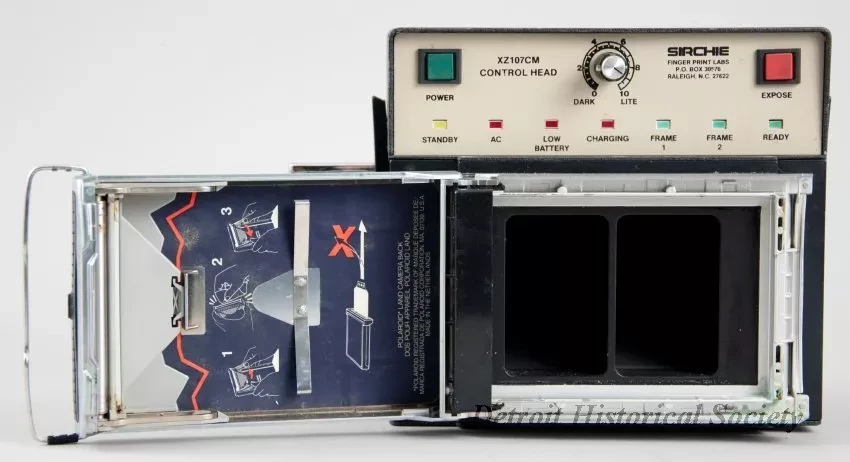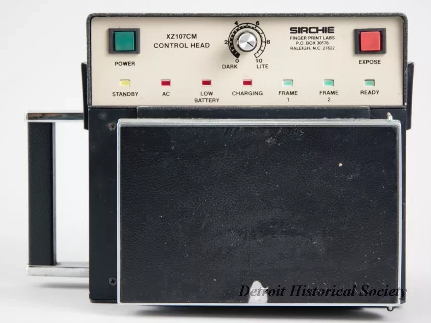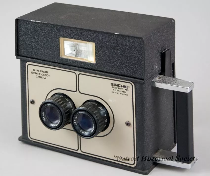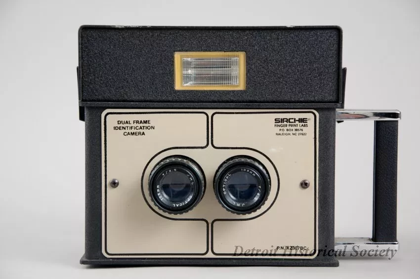 One "Dual Frame Identification Camera" (mugshot camera) that was made by "Sirchie Finger Print Labs" and was used by the Wayne State University Police department. The box-shaped, two-piece camera body is made of metal that has been painted flat black and has a stippled finish. The removable battery/flash/control module (serial number 02826) on top has a plug on the underside and latches on the left and right sides which secure it to the lower portion of the body (serial number 02827). The front of the camera has a flash unit on the upper portion and a tan-colored metal faceplate with two lenses on the lower portion. Painted text on the faceplate reads "Dual Frame Identification Camera" and "Sirchie Finger Print Labs, P.O. Box 30576, Raleigh, NC 27622" as well as "P.N. XZ307BC." The back of the camera has control buttons and indicator lights on top and a Polaroid film holder on the bottom. The holder has a hinge on the left side and a spring-type latch on the right. In addition, the camera has a rectangular-shaped handle on the left side, threaded holes for a tripod mount on the bottom, and a charging plug for the upper module on the right side. The camera was designed to shoot two passport-sized photographs - one for each lens.