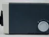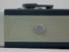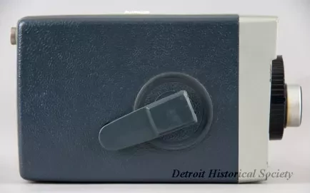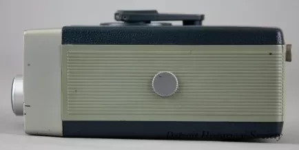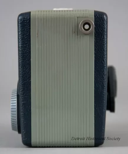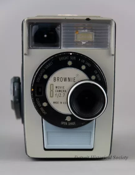 One "Brownie 8 f/2.7" movie camera made by Kodak Corporation. The box-shaped, handheld 8 mm film camera has a charcoal gray and pale green plastic body with a silver-colored metal front. A small viewfinder is located on the back and the left side has a removable panel for inserting/removing film reels. The right side of the body has a folding winding handle which loads an internal spring mechanism in order to drive the film reel at a set speed for a short period of time. The front of the camera has a small lens and an adjacent black plastic adjusting ring shows different aperture settings for various lighting conditions. A gray plastic start/stop button is located beneath the adjusting ring.