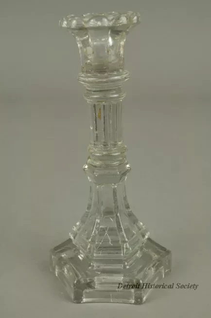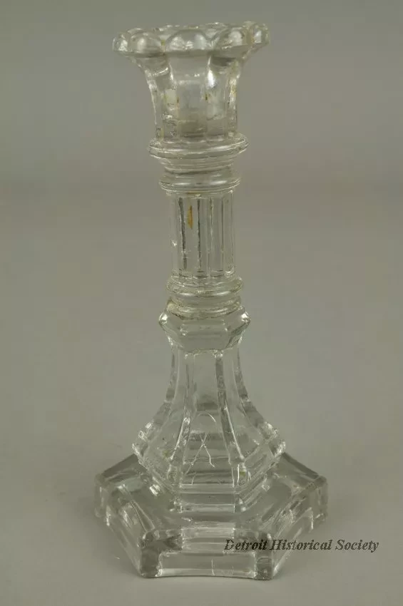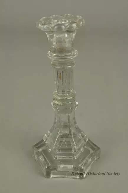Click to enlarge 1952.600.023 Candlestick Clear glass candlestick with hexagonal base, ribbed stem and scalloped top. Date c. 1870 Collection Furniture Material glass Request Image