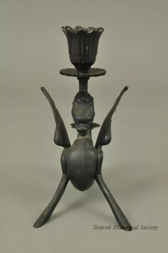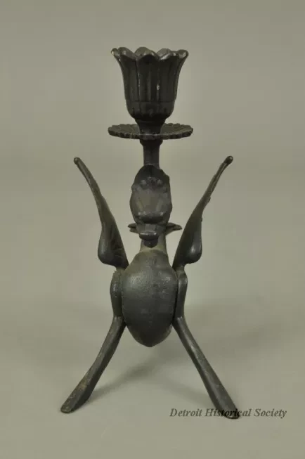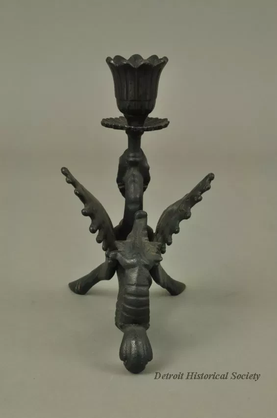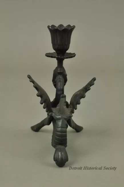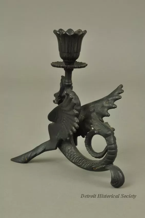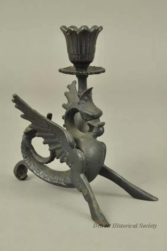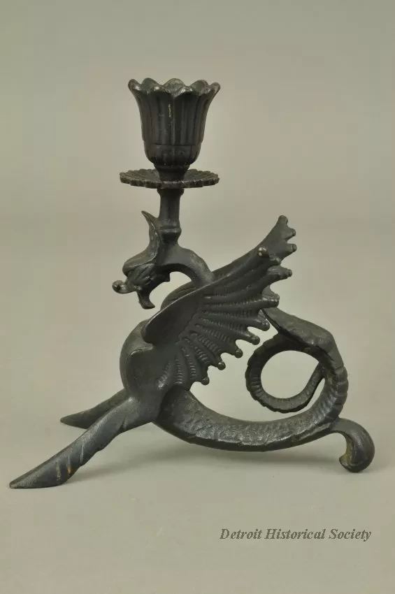 Wrought iron candle holder a base shaped like a dragon with wings and curling tail.
