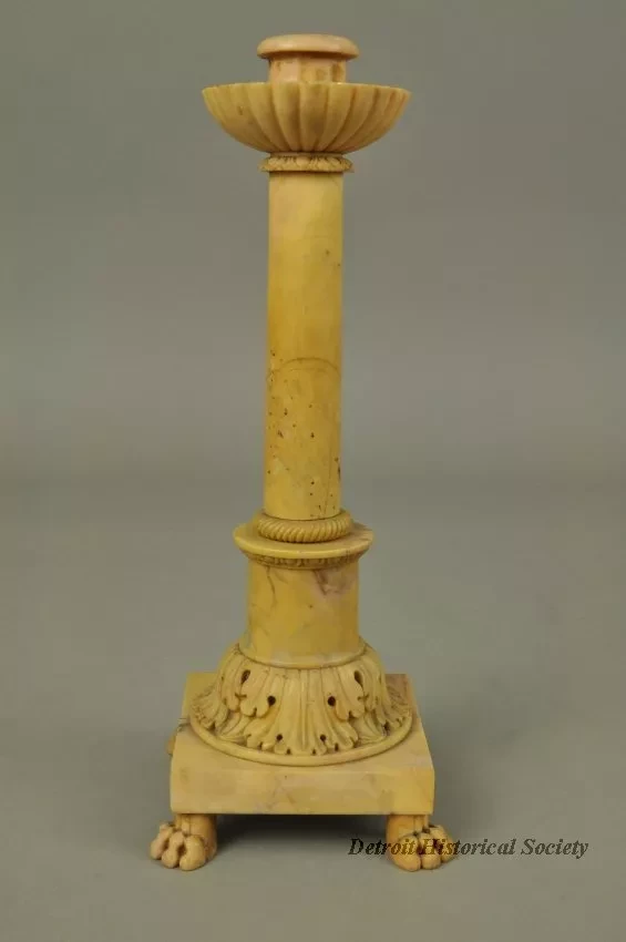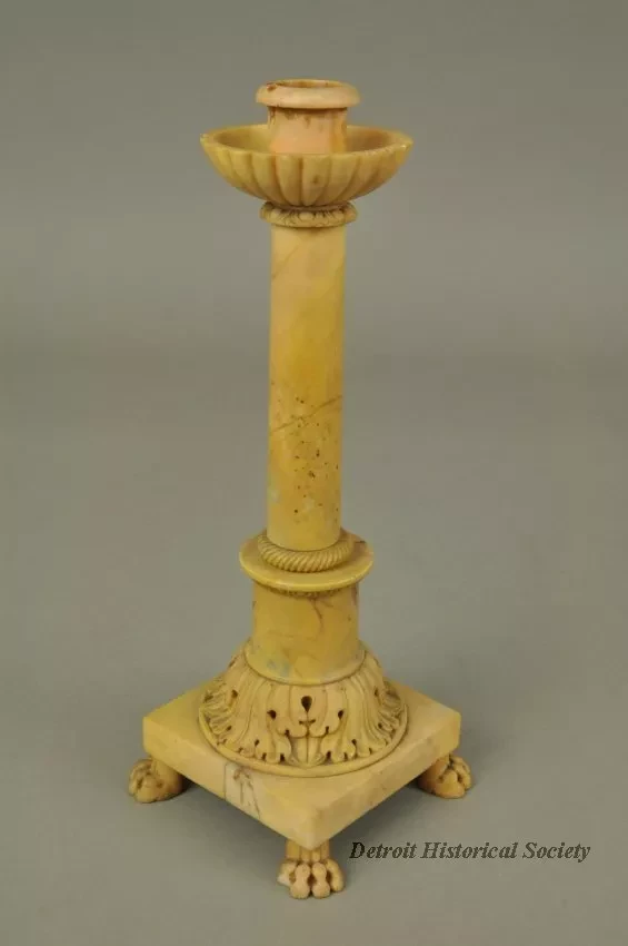 Tan marble candlestick with a square base on four feet, and a leaf pattern at the bottom of the stem.