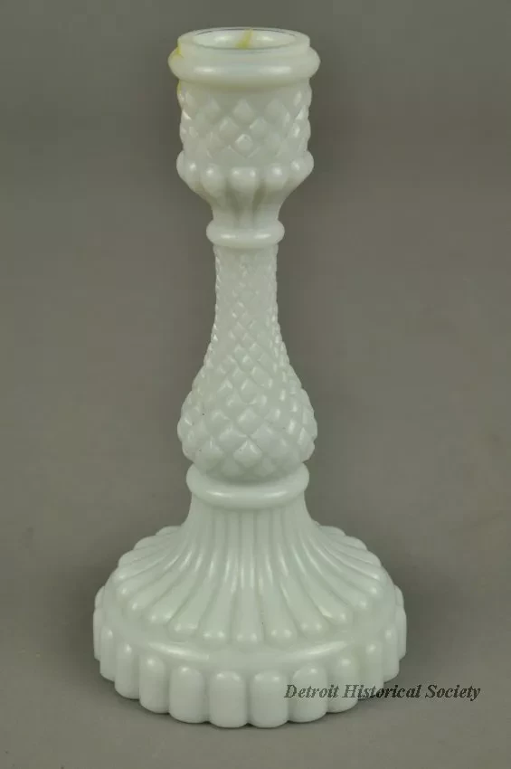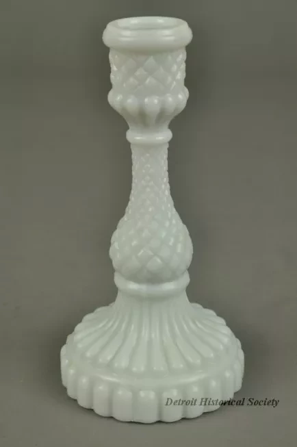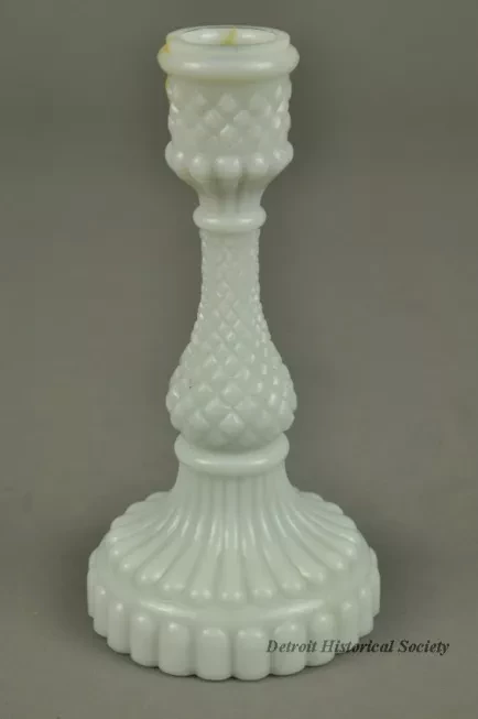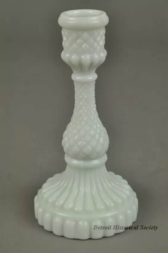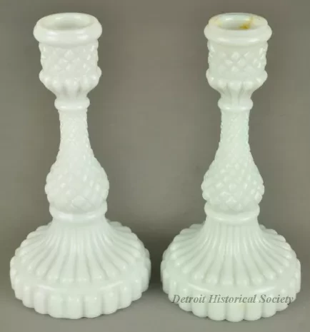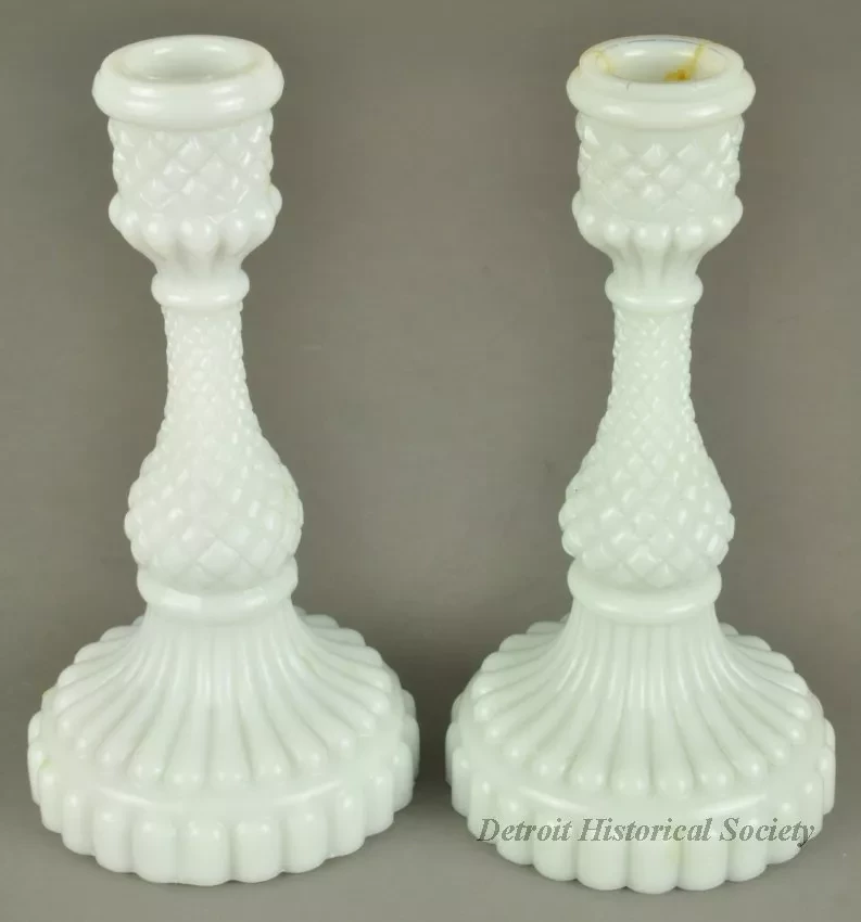 Pair of milk glass candlesticks (a,b), with round base and diagonal crosshatch pattern on the baluster stem.