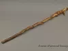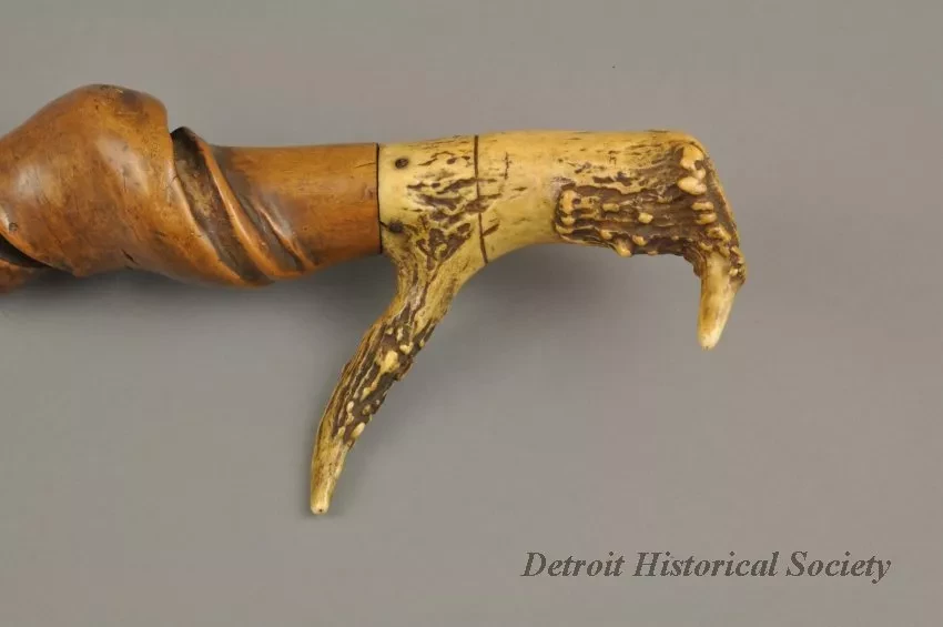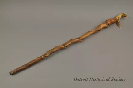 General Cass Cane: "The Cass cane", which was now found its last resting place in the Detroit historical Museum, had reposed in the old Starkweather home for many years. The person who could have told most about its history, Miss Celeste Young, died more than 15 years ago. The cane appears to have been fabricated from a hard maple sapling and is curiously grooved and twisted. While the sapling was growing, it is believed that a sprig of bittersweet or wild vine had entwined itself around the shoot. The vine gradually impressed itself into the wood, both sapling and vine growing. When the cane maker ripped off the vine the encircling groove was the result. The twist becomes more pronounced and bulging near the top, and the head is formed by a two-pronged buckhorn. The stick, still strong and substantial, is unvarnished, but it bears a natural polish due to the ordinary handling of many years.