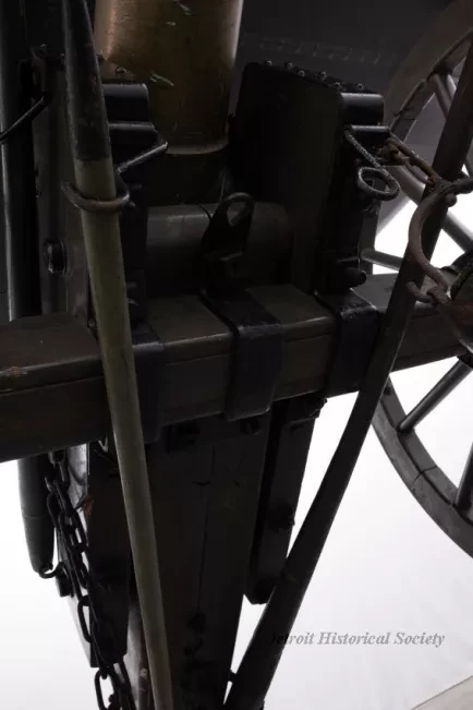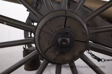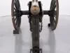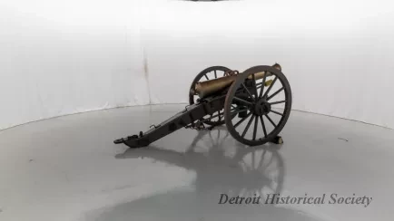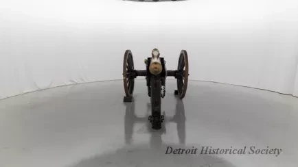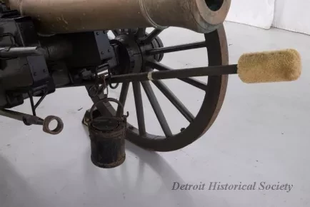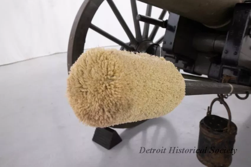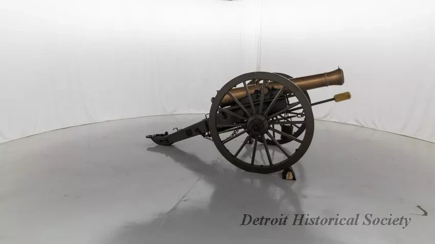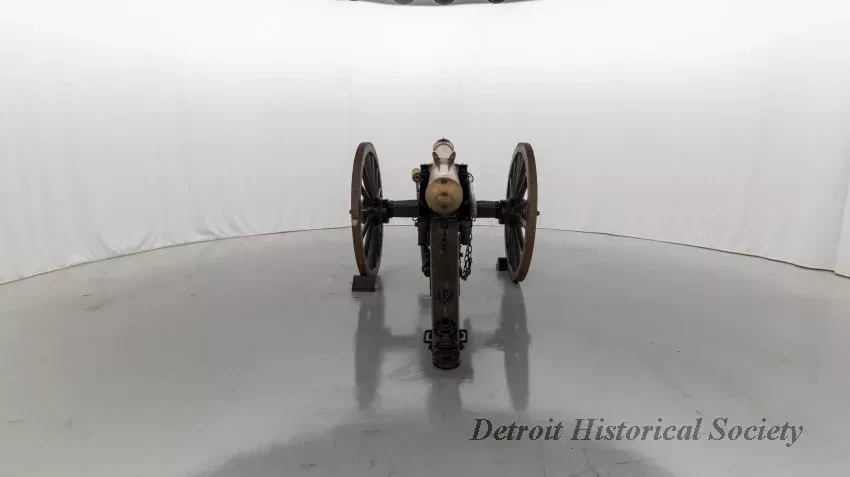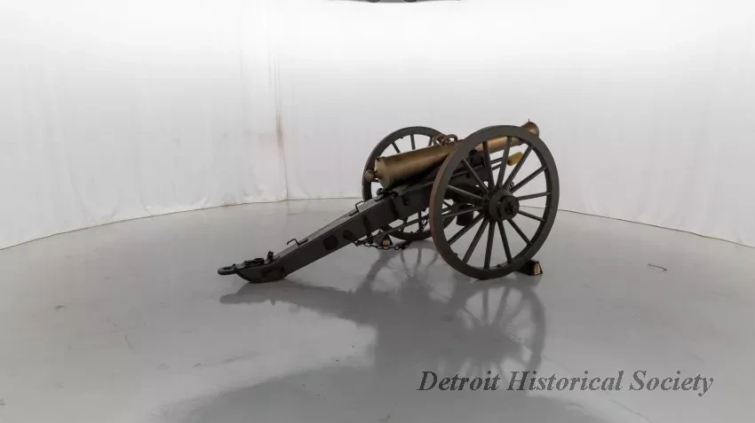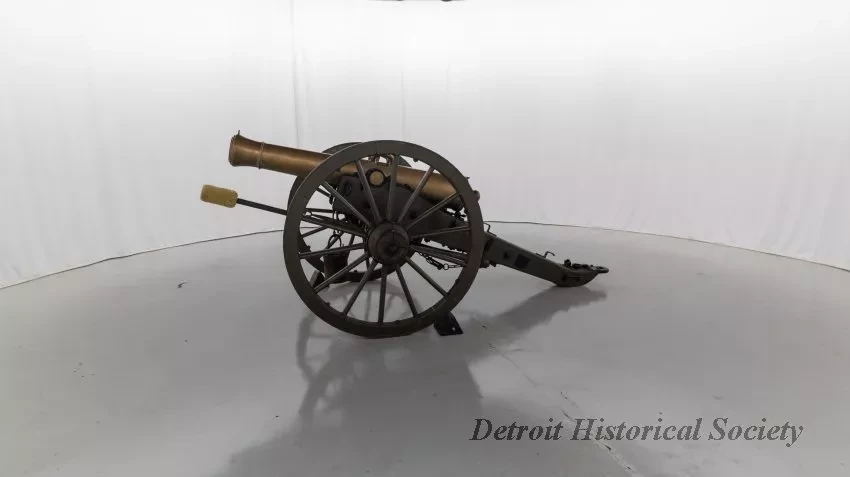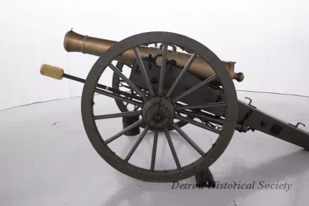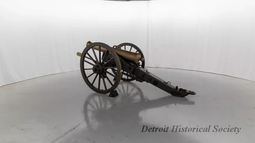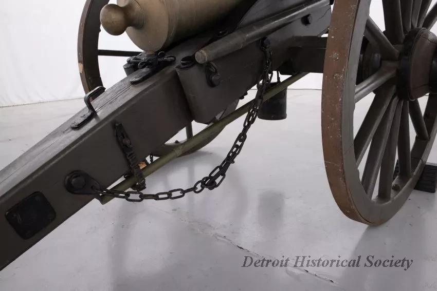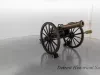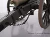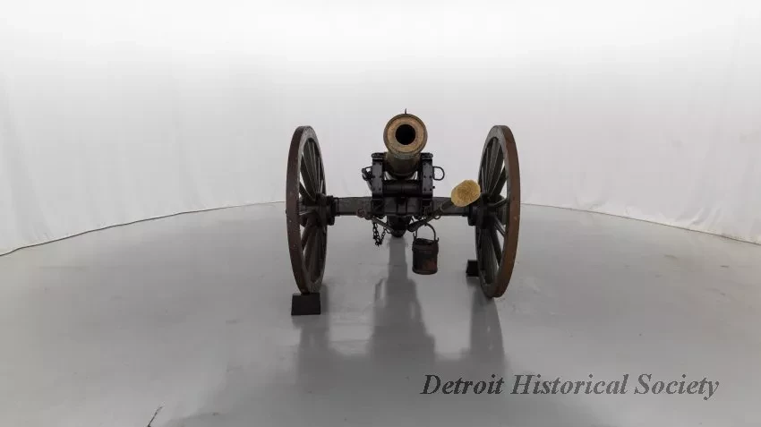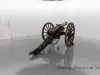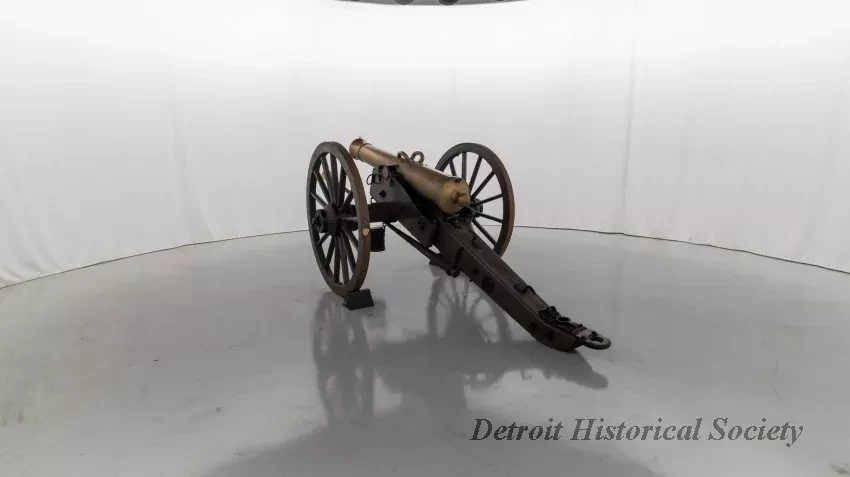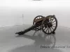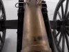 One reproduction Model 1841, 12-pounder field gun (or Model 1857, 12-pounder "Napoleon" field gun). The cannon has a bronze barrel and is mounted on a heavy wood carriage that is is painted green. Metal reinforcement straps, hardware, and other fittings on the carriage are painted black. The cannon barrel has a knob at the breech, a vent hole on top, two handles on top near the trunnions, one reinforcement ring, and a blade-style sight on top at the muzzle. The number, "914," is stamped in small text on the right trunnion. No manufacturer's name or marks are visible on the cannon barrel or carriage. Various tools are carried on the carriage including a combination ramrod/sponge, a pulling worm, a metal grease bucket, and a carriage trail handspike.