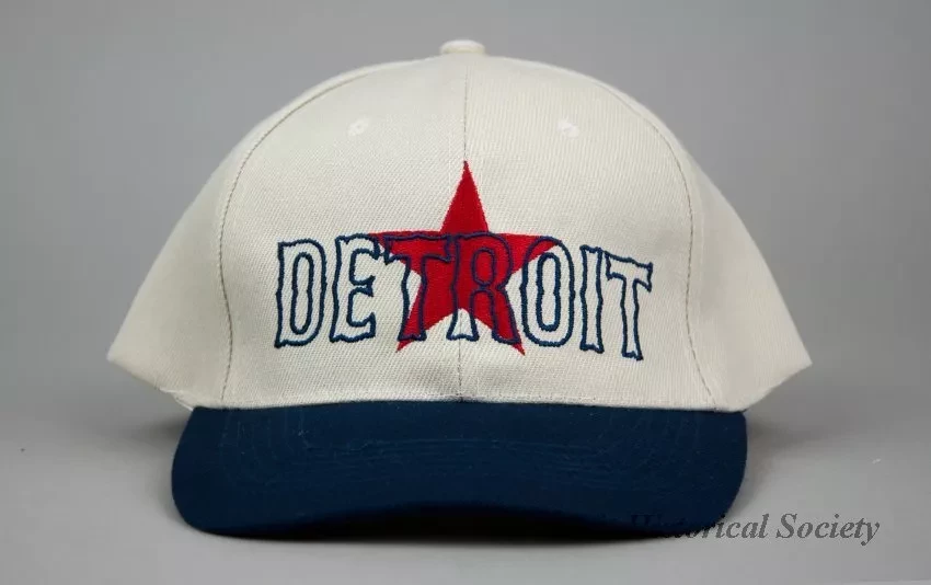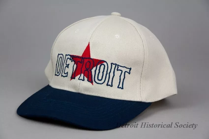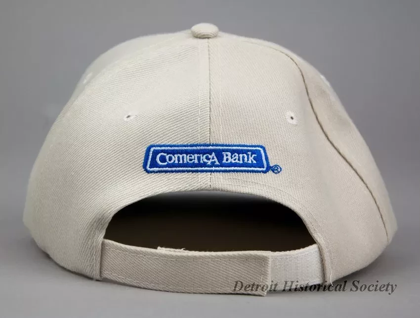 One commemorative baseball cap to honor the "Detroit Stars" Negro Leagues baseball team. The cap is made of tan acrylic fabric with an embroidered red star on the front along with blue embroidered text that reads "Detroit." The cap has a dark blue brim, vent holes in the top panels, and an adjustable acrylic/velcro headband at the back. A blue/white embroidered "Comerica Bank" logo is shown above the adjustable headband. A label on the inside headband reads "Associated Premium Corporation, associatedpremium.com," and "Made in China, 100% Acrylic."