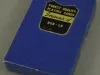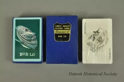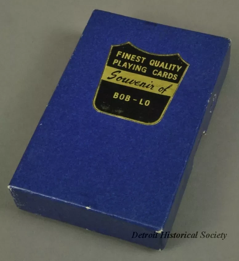 Deck of souvenir playing cards with cardboard box from Boblo Island. The box is blue with "Finest Quality Playing Cards. Souvenir of Bob-Lo," printed on the top in gold and black. The cards within are still within their cellophane wrapper, and have a photo of the Boblo boat STE. CLAIRE shot from above on the card backs. A sticker of the same image is also on the underside of the box.