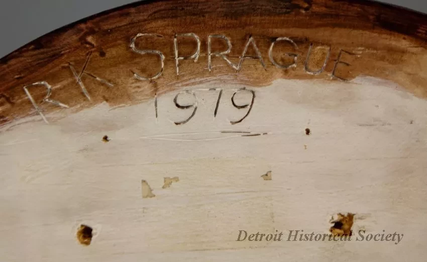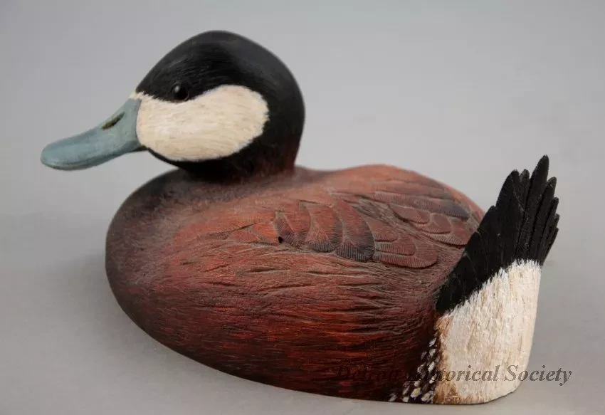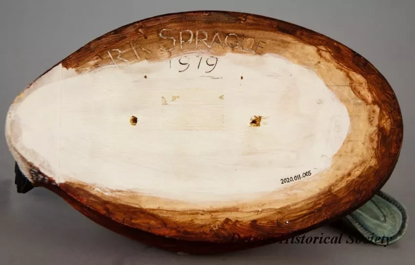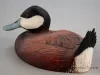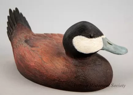 One hand carved wooden figure of a duck. The carving is made of a lightweight, medium-grained wood and shows detailed sculpting and shaping. It has raised tail feathers and has been finished with black/red/brown/white/blue/gray paint to depict a Ruddy drake. Its eyes are made of small circular black plastic discs with a convex outer surface and have been attached on each side of the head. The maker has carved his name, "R. [Richard] K. Sprague, 1979," on the underside.