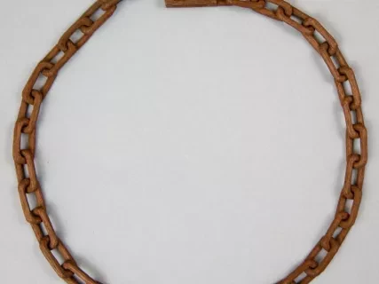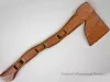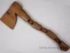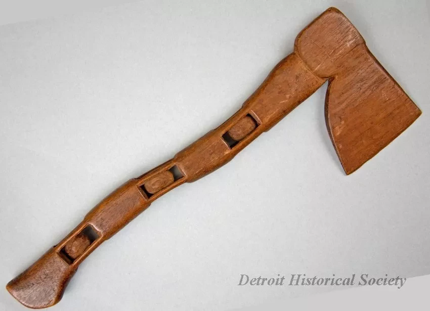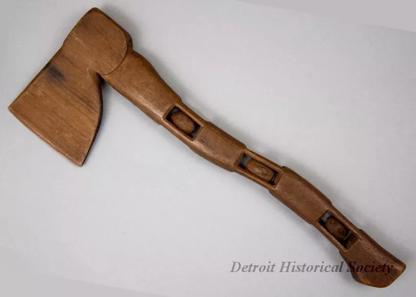 One African American folk art wood carving of a hatchet. The carving was done from a single piece of medium-grained wood and depicts a hatchet blade with a short curved handle. The handle is embellished with three intricate "ball-in-a-cage" carvings. The wood has been minimally finished with an oil or stain which gives the surface a dark brown color and allows the wood grain to show.