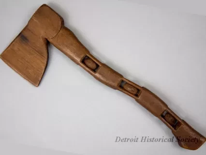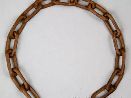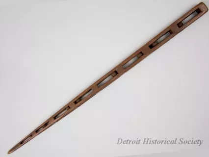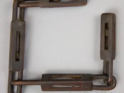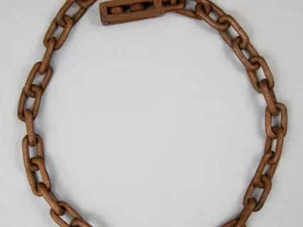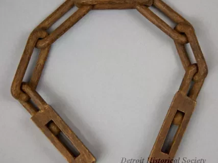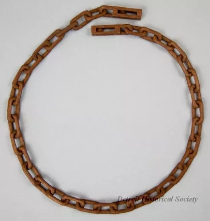 One African American folk art wood carving of a section of chain with boxes at the ends. The carving was done from a single rod of medium-grained wood and depicts 34 separate chain links with small, narrow boxes at the ends. Each box includes a half link at one end as well as an intricate "ball-in-a-cage" carving. The wood appears to be unfinished and has a medium brown color.