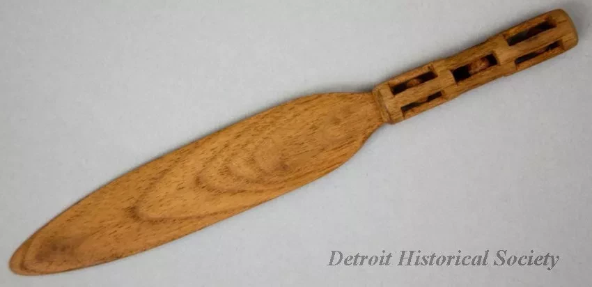 One African American folk art wood carving in the shape of a letter opener. The carving was done from a single piece of medium-grained wood (possibly walnut) and depicts a wide, spear-like blade with a blunt tip and a short, round rod handle. The handle includes three intricate "ball-in-a-cage" carvings. The wood has a light brown color. It has been sanded smooth and the surface is unfinished.