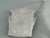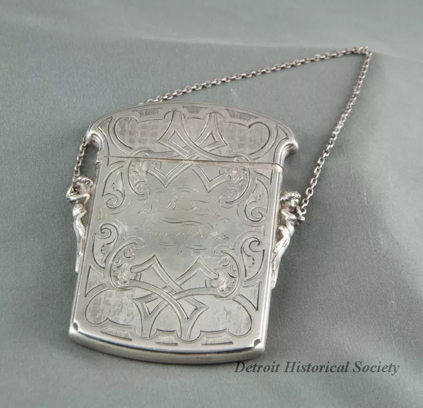One rectangular silver calling card case with flared-edge hinged top. On the sides near the opening, the case has two cherubs which holds the silve chain. The body of case has engraved linear designs and swirl designs. The center front is engraved with: "L.B. Turner, Jany 1st, 1866". L.B. Turner was donor's great aunt.