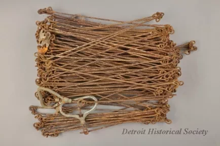 Engineer's chain, consisting of 100 iron links, each exactly one foot long, with bronze handles at each end and marks along length. (A surveyor's chain is only 66 feet long with links of 7.92 inches.) Chain found by W.J. Fraser in an excavation around Cleveland, OH.