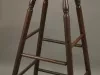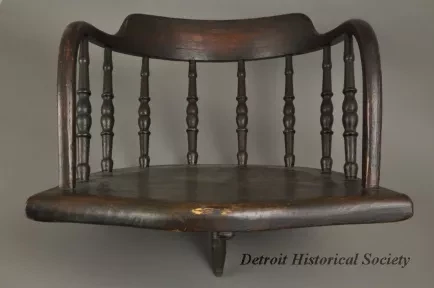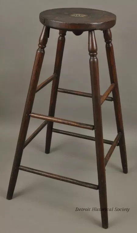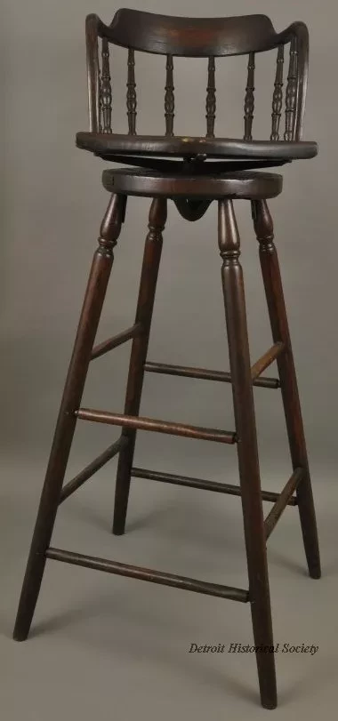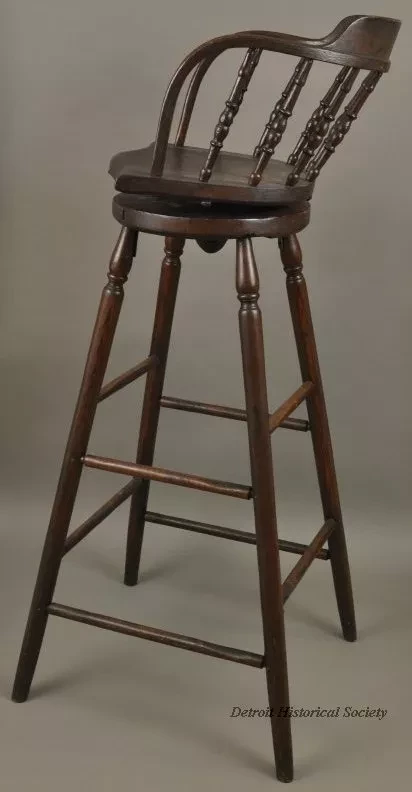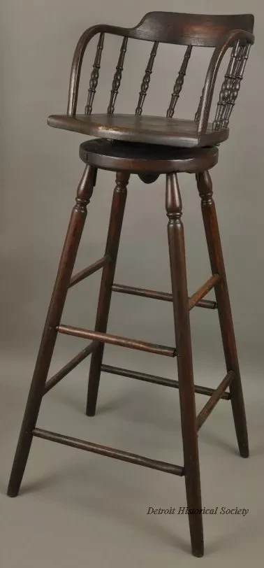 Watchman's chair. A tall swivel chair once used by a watchman stationed at City Hall to spot fires. Chair has a curved back and arm rests supported by eight, turned-baluster spindles. A metal post at the bottom of the seat fits into the top of the base where it's supported from underneath by a curved metal brace. Each leg is attached to the top part of the base with a metal bracket. The upper part of the legs have been baluster turned, while the lower majority of them are simply round. Two tiers of rungs support the legs.
