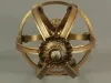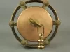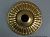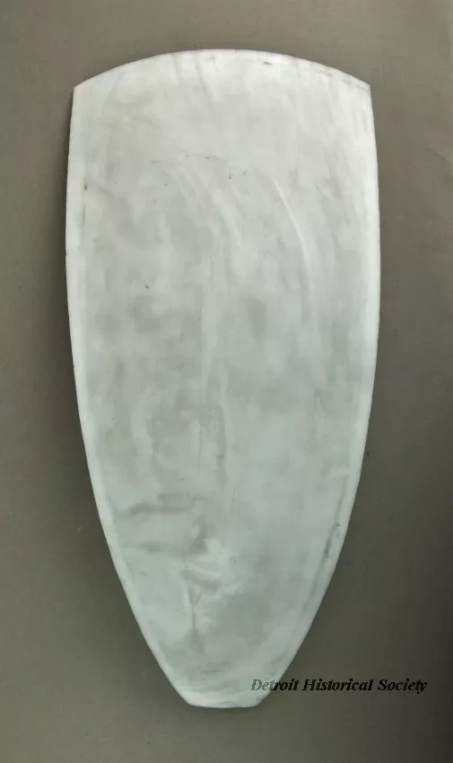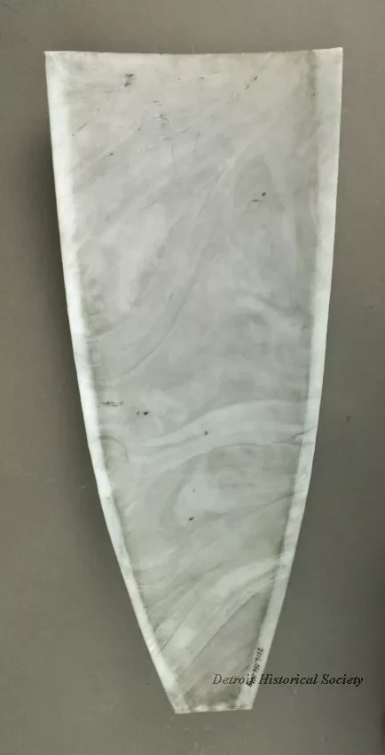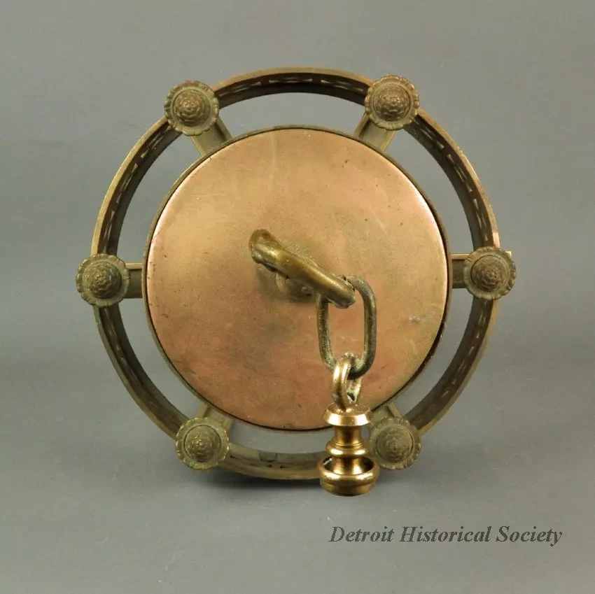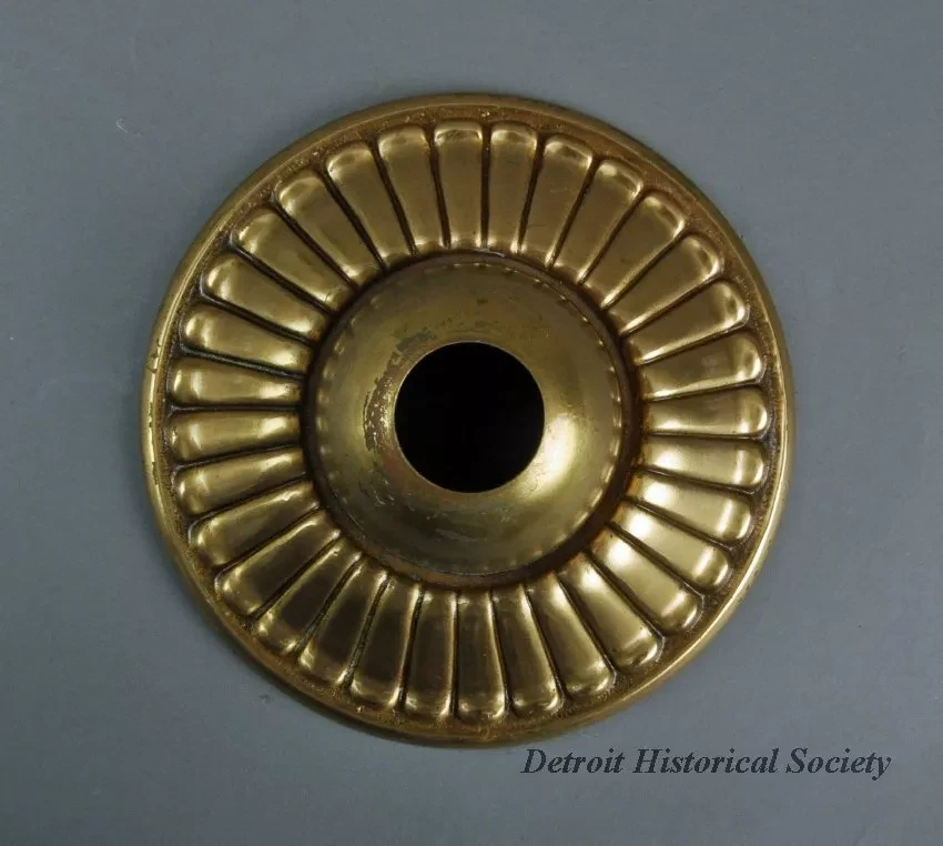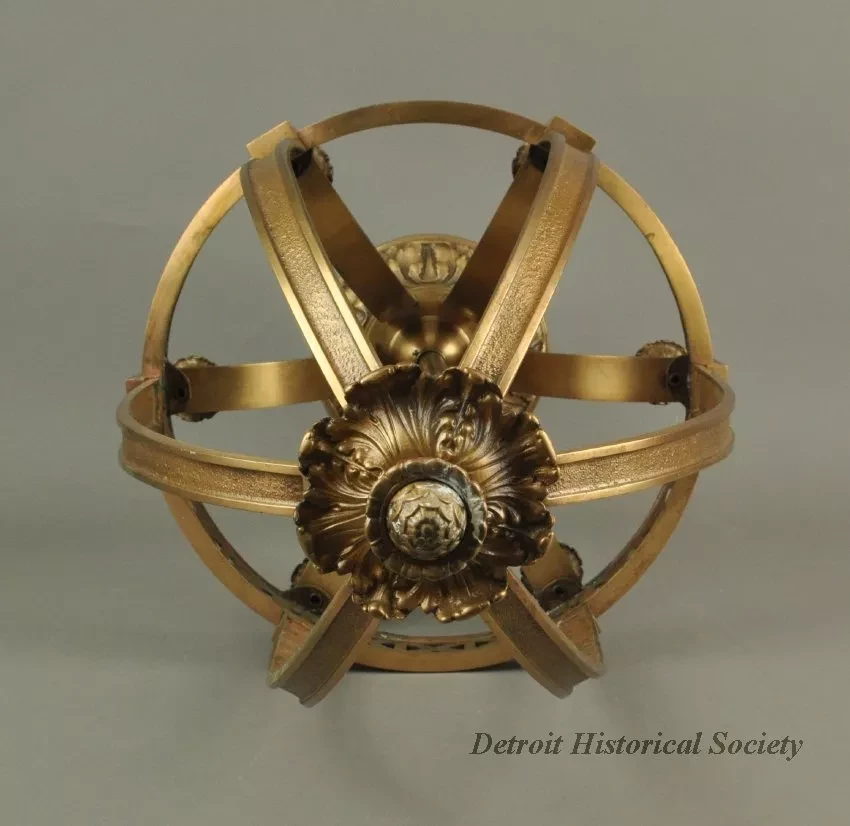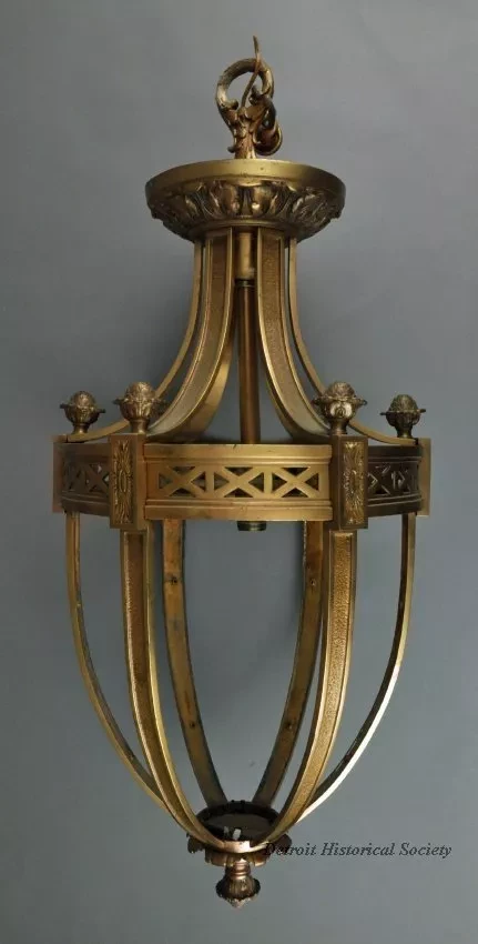 One decorative brass chandelier from the old Detroit Municipal Court Building which was located at St. Antoine and Macomb Streets. The chandelier is of a pendant style and is fitted with a single electric bulb. The brass frame holds six curved and tapered opaque glass panels around the perimeter. The tapered panels are wide at the top and narrow at the bottom. The bottom of the fixture is finished with a decorative brass finial which matches the style of the six finials that are located along the circular framework above the glass panels. A decorative brass escutcheon plate is also included for the ceiling.