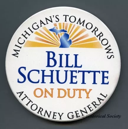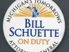 One pair of drink coasters from the Republican Attorney General candidate, Bill Schuette. The circular-shaped coasters are made of a white ceramic material that has been stamped with blue, black, and gold-colored text that reads "Michigan's Tomorrows, Bill Schuette, On Duty, Attorney General." A blue and gold-colored drawing of a map of Michigan with radiant rays of sunshine is shown near the top of the coaster. The bottom of the coaster is covered with a thin layer of black foam.