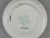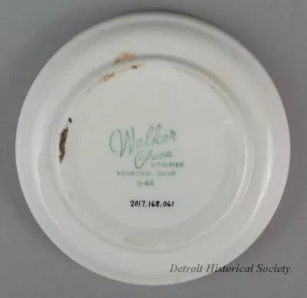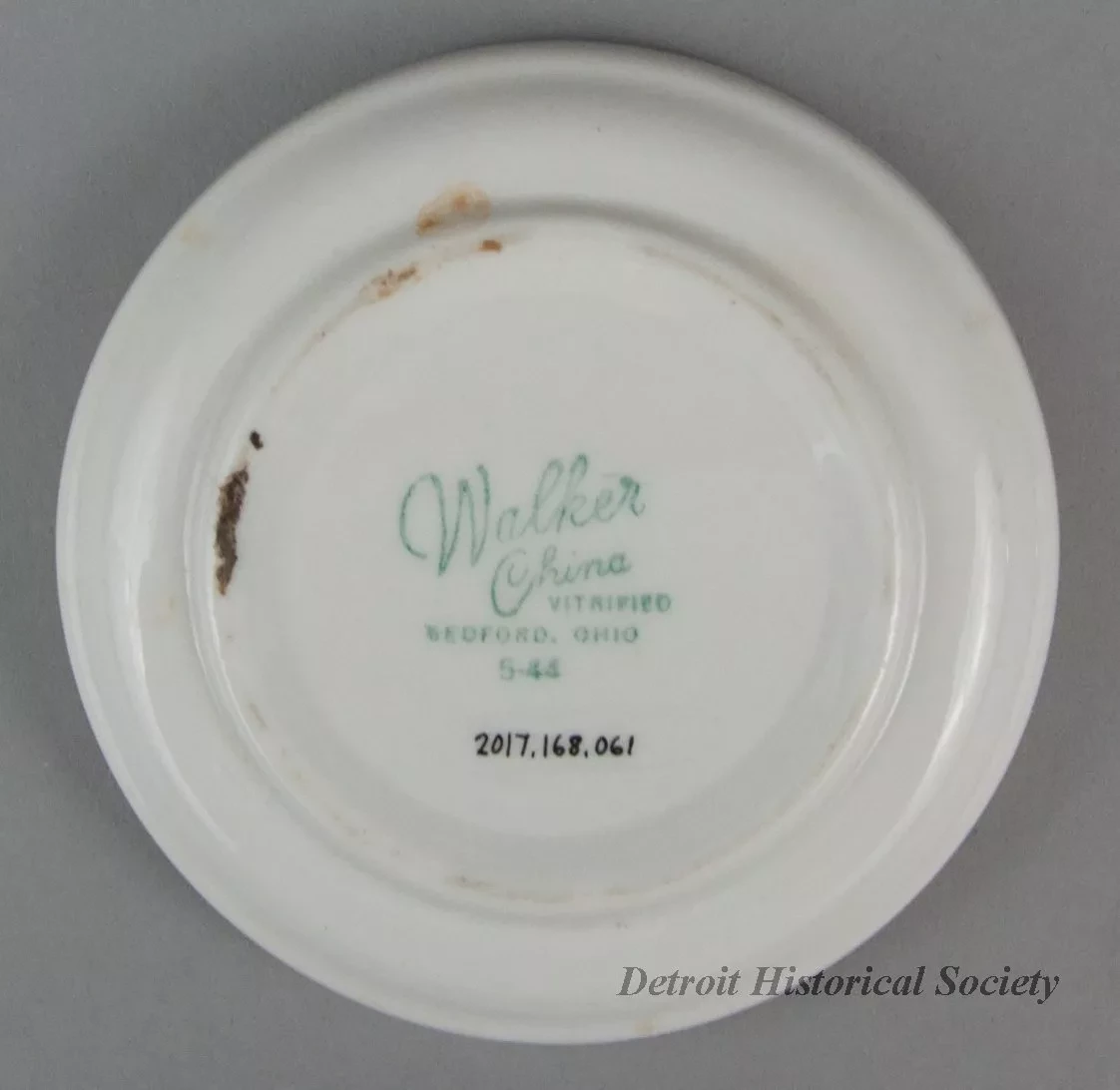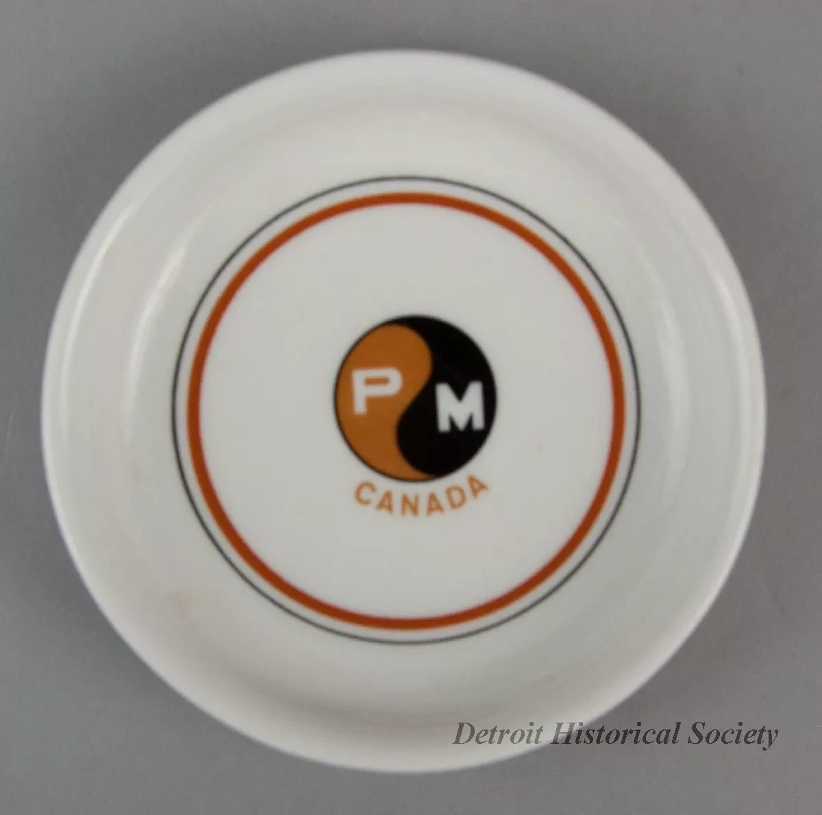 One drink coaster from a dining room of the Pickands Mather & Company steamship fleet. The coaster is made of heavyweight, white glazed china. It has a thick, vertical outside edge and a small curve beneath with a short, flat base. The inside edge has a short curve that blends into a flat bottom. Two narrow black and brown stripes form large concentric circles on the bottom and the circular, black/brown "PM" company logo is stamped at the center along with brown text that reads "Canada." The underside is stamped with black text that reads "Walker China, Vitrified," and "Bedford, Ohio, 5-44."