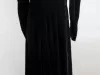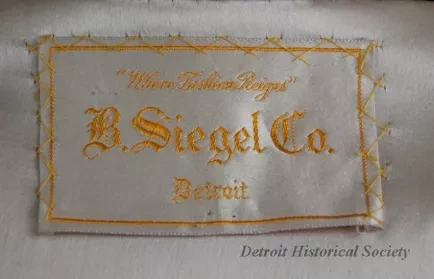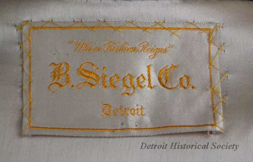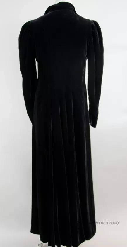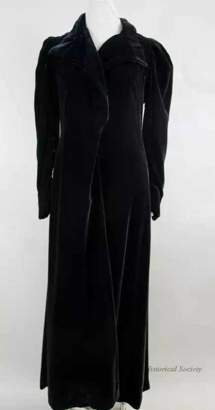 One lady's black velvet evening coat. The floor length coat has a two-inch standing collar and long sleeves with structured shoulders that have a decorative gather at the elbow and taper toward the wrist. There are two front button closures, one located at the collar and one at the waist as well as an interior ribbon tie located at the waist. The coat is fully lined with a backed cream satin and includes a manufacturer's label that reads "Where Fashion Reigns, B. Siegel Co., Detroit."