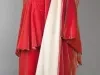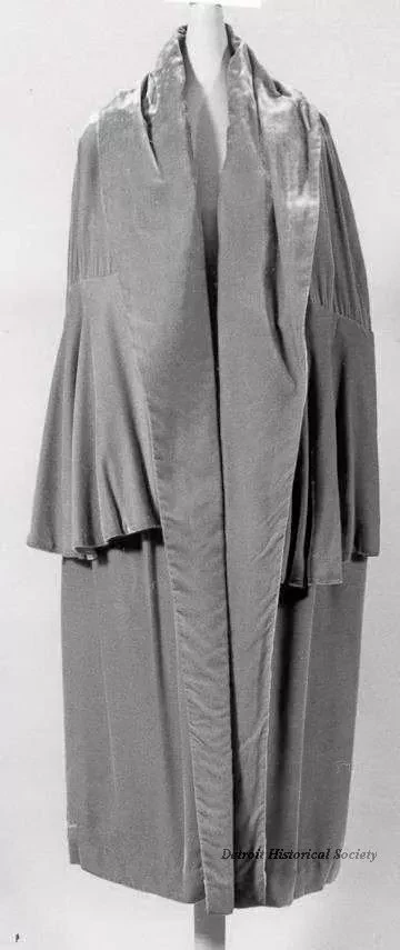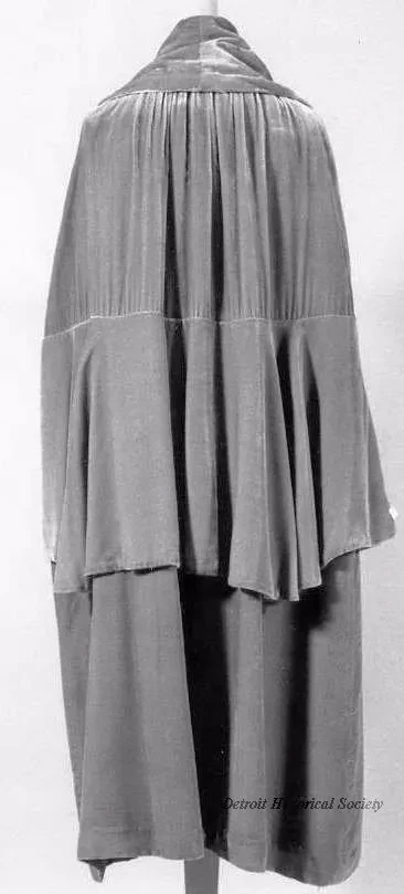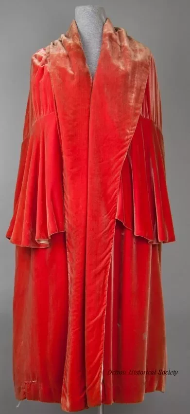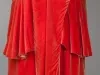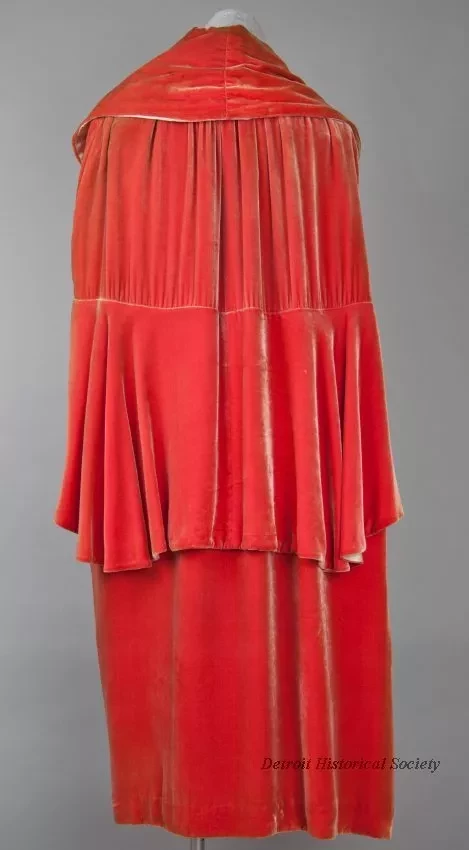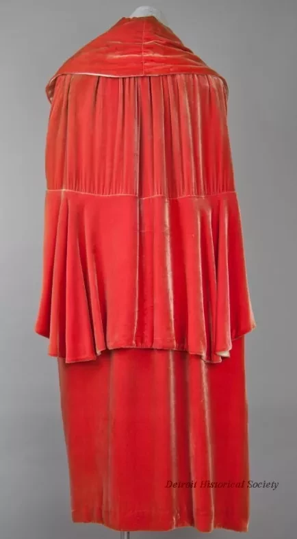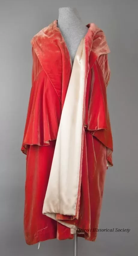 One coral velvet women's cape lined with white satin. The cocoon cape has a shawl collar and a loose velvet ruffle, twelve inches wide, that is attached to the cape about nine and one half inches below the collar line. The cape has no closures.