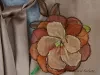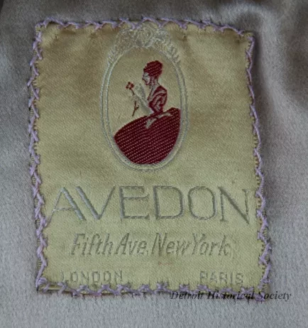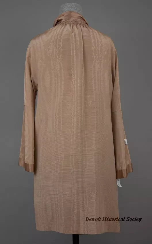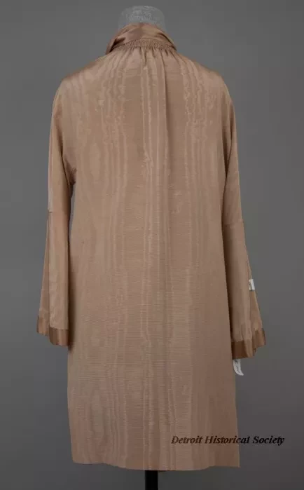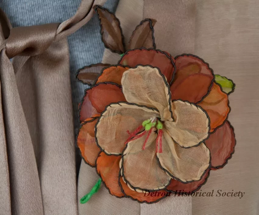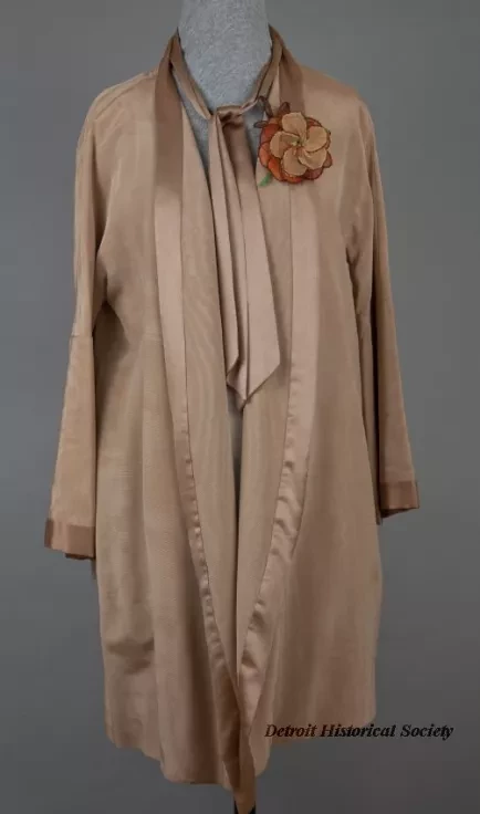 One lady's tan silk faille summer coat. The coat has an ascot collar made of tan silk, long sleeves with tan silk detail around the cuffs, and no front closures. The coat includes one yellow and one orange artificial flower detail made of wire and tulle, that is hand-tacked onto the front-right facing panel. The lining is made of matching tan silk and includes the label, "Avedon, Fifth Avenue, New York."