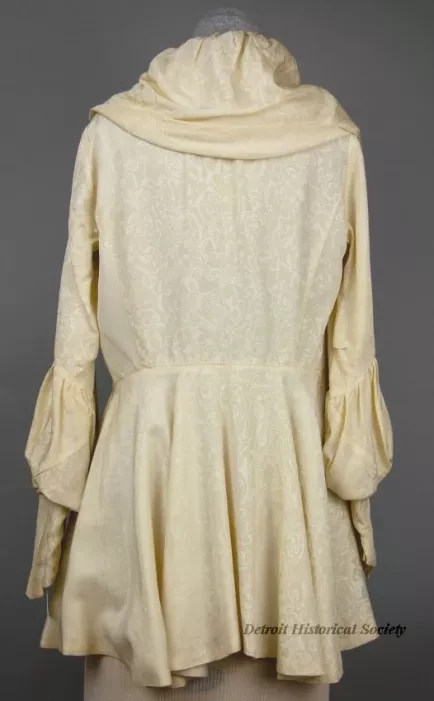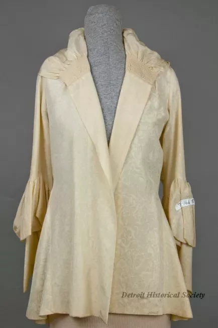 One lady's cream silk evening coat. The thigh-length coat has a shawl collar with micro-pleating located on the front shoulders and wide pleating at center back that allows the collar to extend into a hood. The coat has long sleeves with a ruffle located at the elbow and notched cuffs. The coat has no closures. The lining of the coat is lightweight cream silk and there is no manufacturer's label.