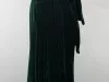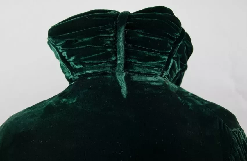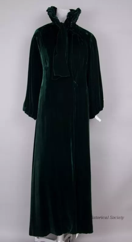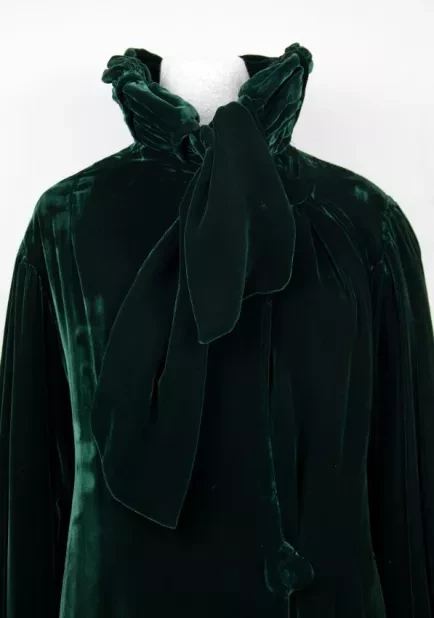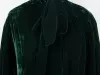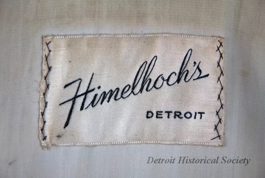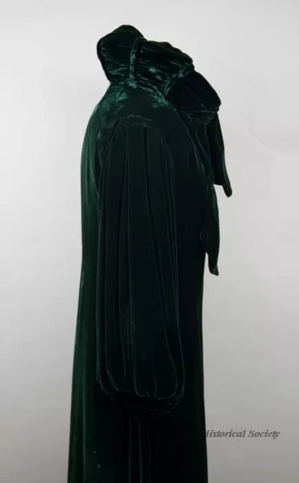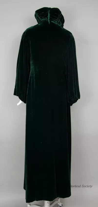 One lady's dark green velvet evening coat. The ankle-length coat has a pleated round collar and drop shoulders with full sleeves and two inch cuffs. It has two button closures, one located at the collar and one at the bust. The coat is lined in white silk and includes a label located at the nape that reads "Himelhoch's, Detroit," and another, located at the interior side seam, that reads "National Coat and Suit Recovery Board," and "Consumer Protection label OTF Manufactured Under Fair Labor Standards."