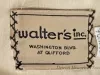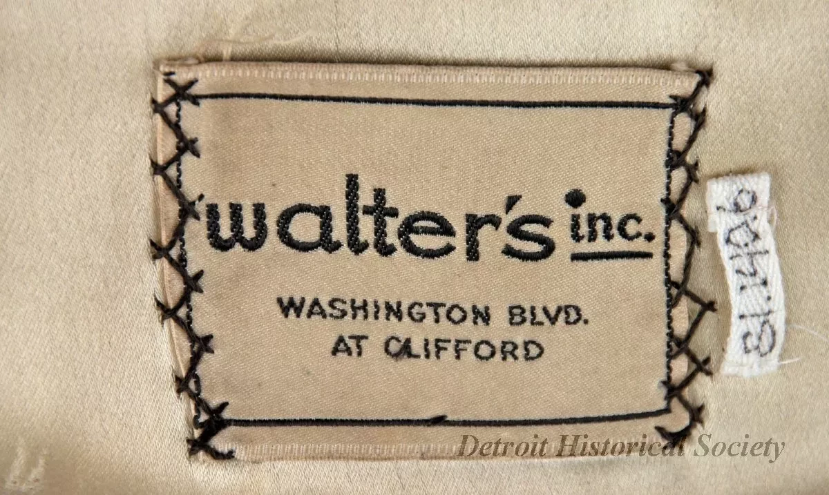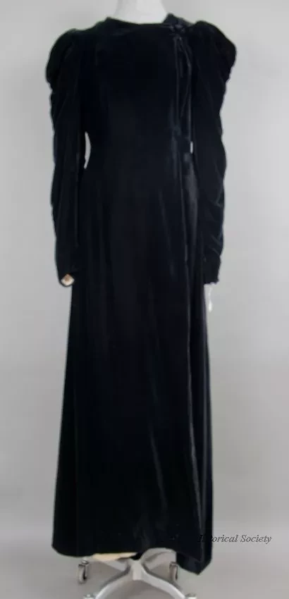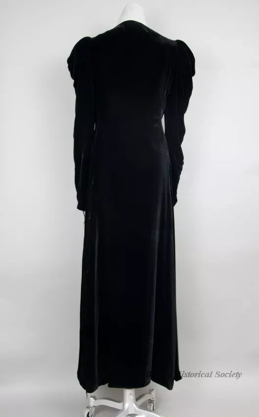 One lady's ankle-length black velvet evening coat. The coat has structured shoulders and long sleeves that taper toward the wrist and two front button closures, one located at the collar and one at the waist. The coat is lined in ivory silk satin, has an interior ribbon tie closure and a label that reads "Walter's, Inc., Washington Boulevard at Clifford." The label is located at the interior center back and is sewn upside down.