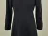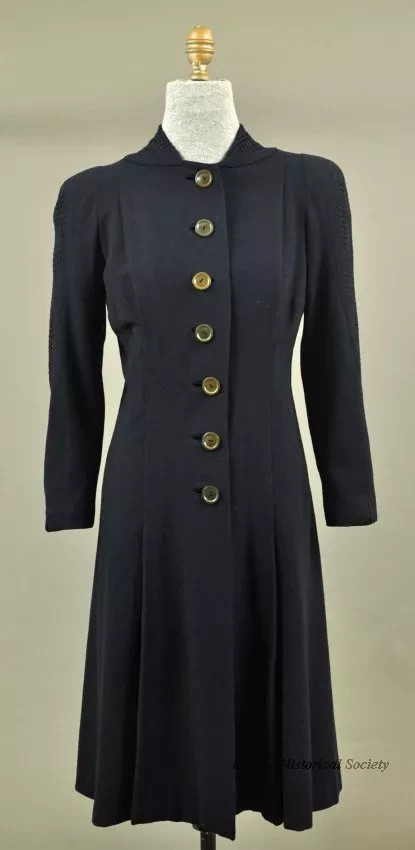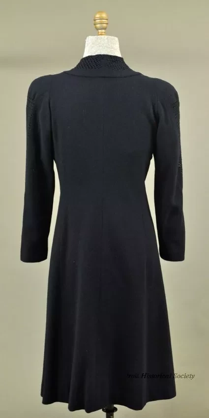 Woman's princess-style navy blue wool coat. The coat has a round false collar, padded shoulders, narrow sleeves, front seams on the body which end in pleats in the skirt, seven buttons down the center front, and a below-knee length. The sleeves and collar are decorated with overlay panels of a woven open mesh design. The coat is lined with navy taffeta. Label on inside back of neck: "Hattie Carnegie, Inc."
