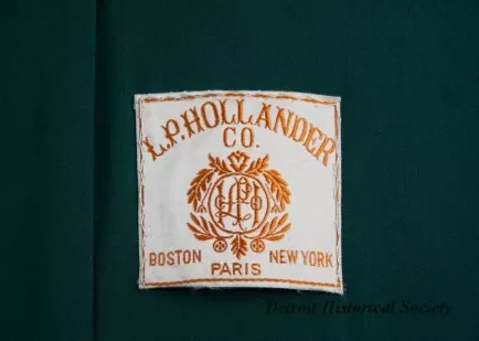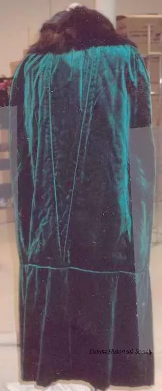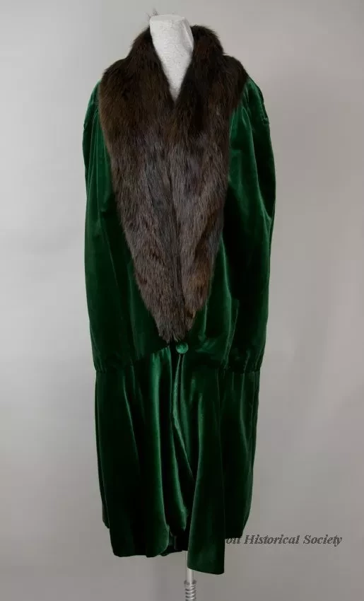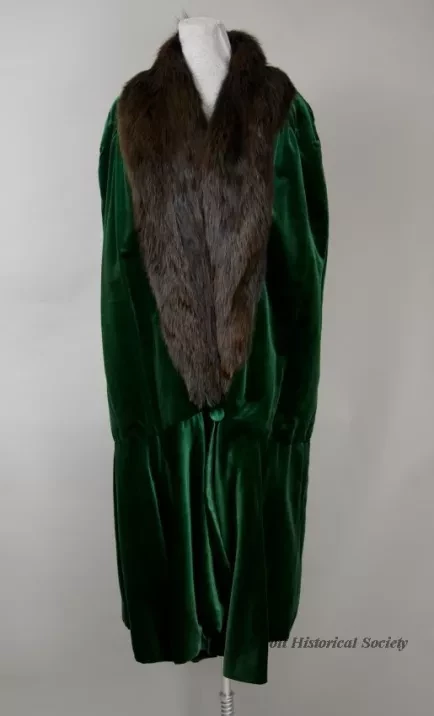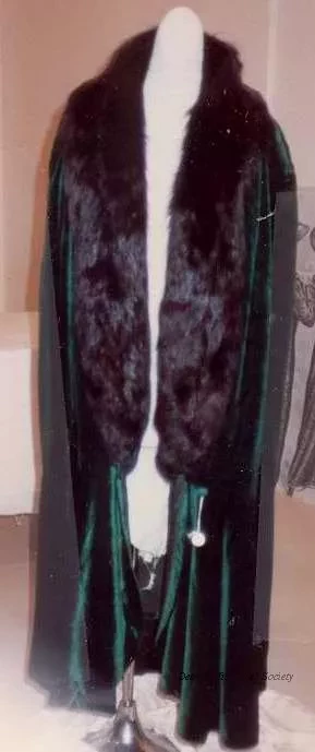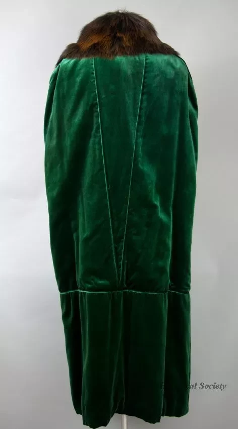 One lady's emerald green silk velvet coat with a brown mink fur collar. The mid-calf length cocoon coat has a drop waist and a single velvet-covered button closure located at the left hip. The coat has green velvet piping detail at the shoulder points, center back, and the waist. The cape is lined with green crepe and has two interior velvet tie closures. The cape also has an interior pocket on the right front panel along with the label "L.P. Hollender and Co., Boston, New York, Paris."