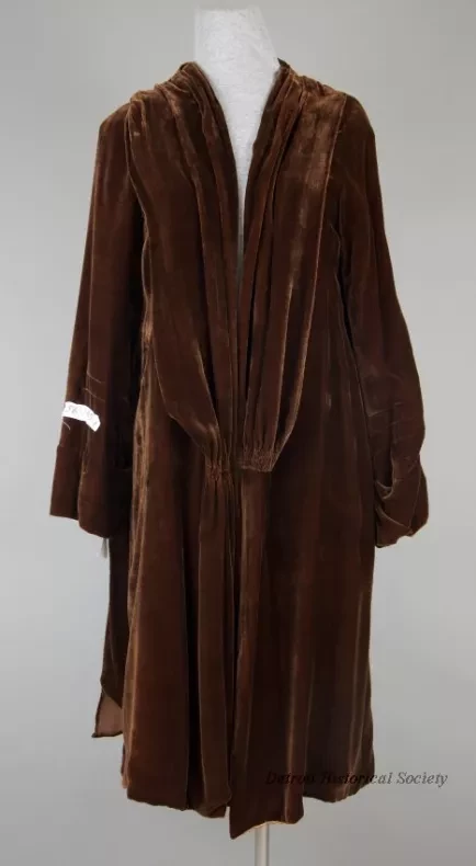 One lady's brown velvet coat. The coat has a wide collar panel that extends to the front hip-line and is finished with a mini-pleat detail. The sleeves are wide and feature four-inch wide cuffs. The coat includes a long brown velvet scarf that can be secured through a loop at the center back collar. There are no closures. The interior is lined with tan silk and includes the label "Pack-Wolin, Detroit Label", which is sewn in upside down.