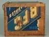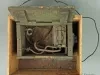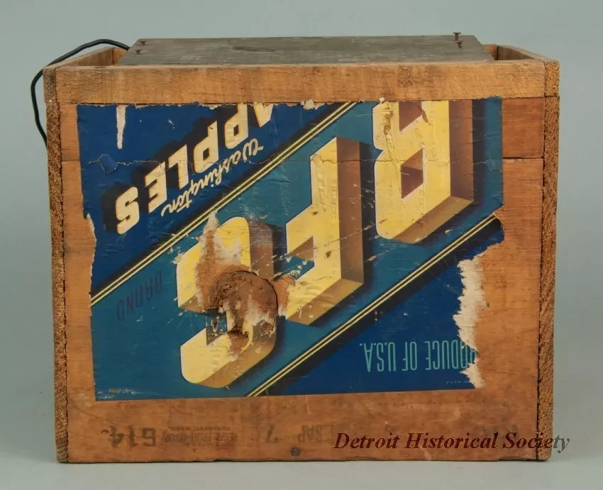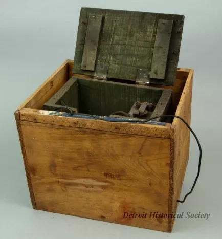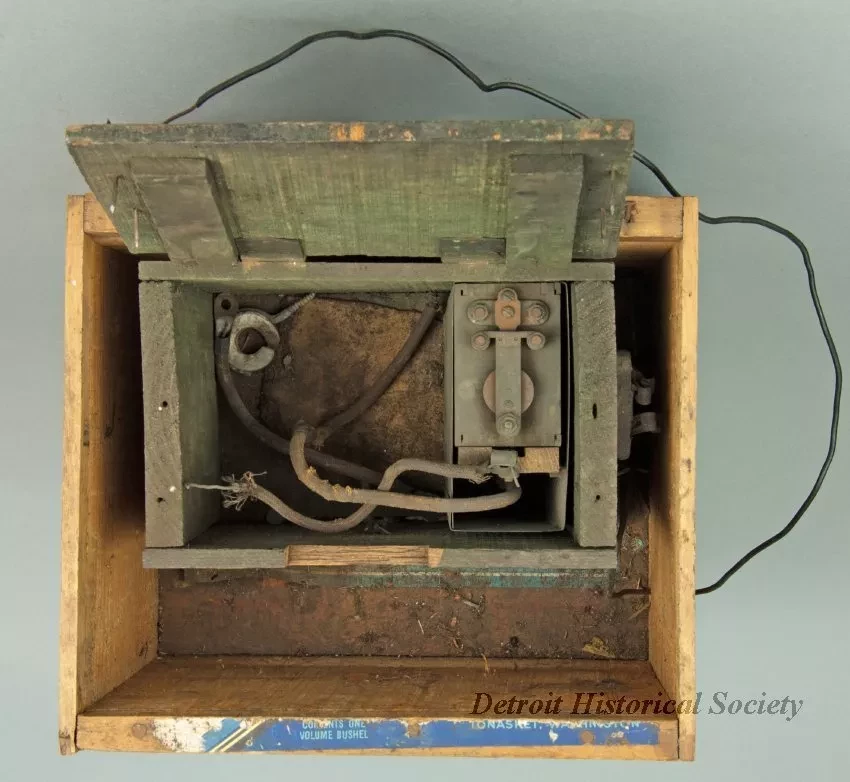 Appears to be an automobile induction coil mounted inside two homemade wooden boxes. The coil is similar to those used on Model T Fords and has two cloth-insulated wires attached. It is mounted in a box with a hinged and nailed lid. This box has a large space next to the coil, possibly for batteries. A third wire, runs from the bottom of the coil through holes out through both boxes. The outer box appears to have been made from an apple crate as portions of the labels remain visible.