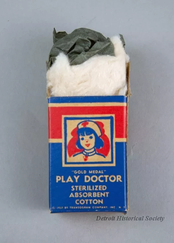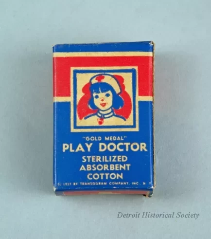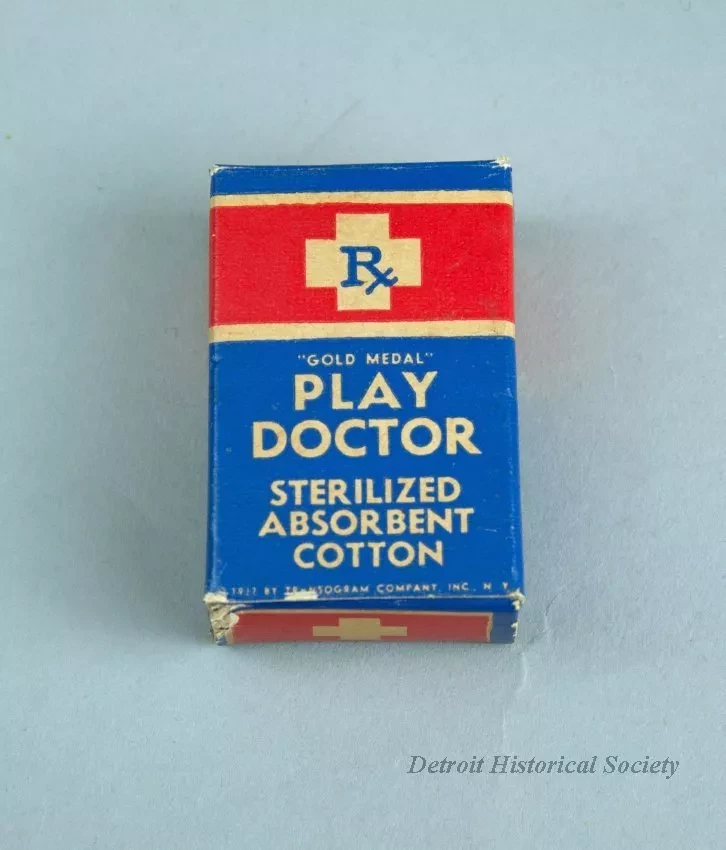 One miniature cardboard box of cotton from a child's play doctor kit. Contains a ball of cotton wrapped in blue paper. Cardboard box is blue and red with white lettering that reads " 'Gold Medal', Play Doctor, Sterilized Absorbent Cotton, © 1937 by Transogram Company, Inc." Front of box has an image of a girl in a nurse's cap.