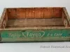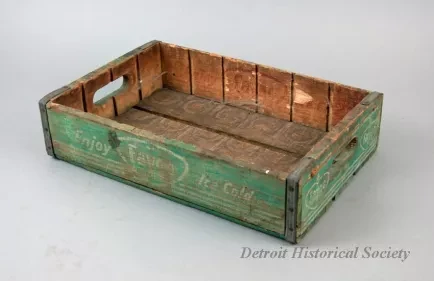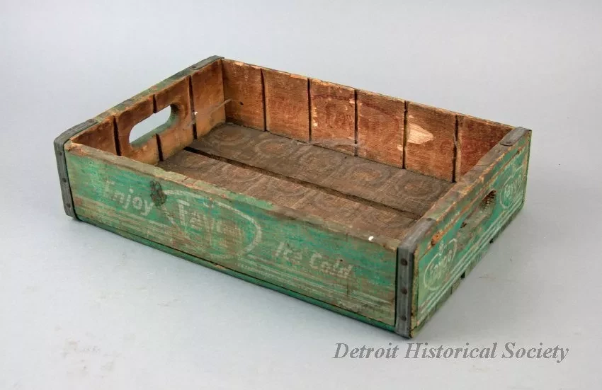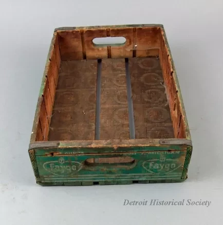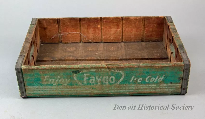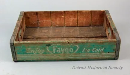 One Faygo delivery crate. The crate has wood slats on all four sides and on the bottom. The end panels have cutouts near the top for handles and are stamped with white text on a blue background that reads "24-7 Ounce Faygo" and "Detroit 7, Michigan, Faygo." The exterior side panels are stamped with white text on a blue background that reads "Enjoy Faygo Ice Cold" and the interior side panels are stamped with red text that reads "Enjoy Faygo Ice Cold." Edges on the end panels are reinforced with strips of galvanized steel that have been nailed in place.