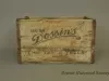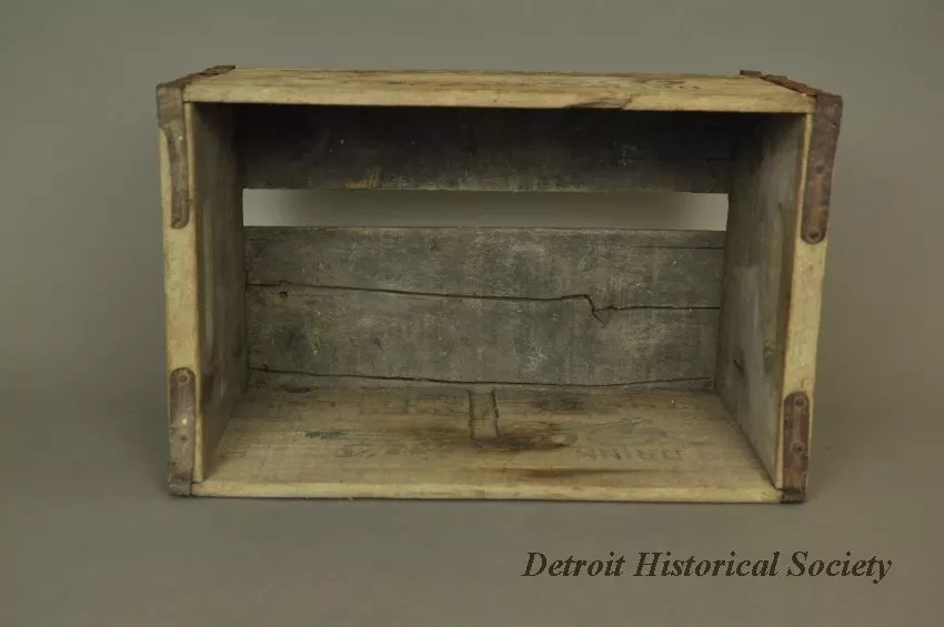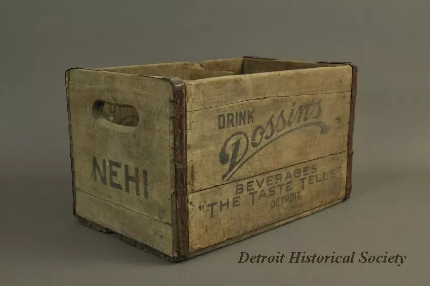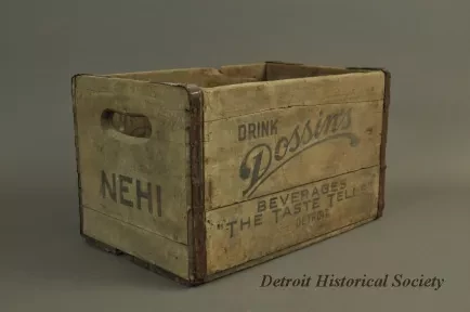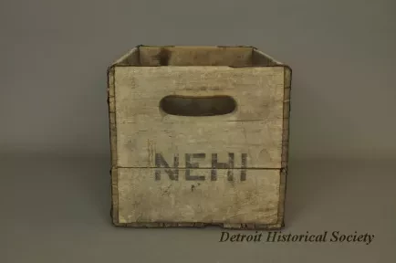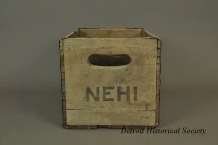 One wooden crate. The crate is made of 1/2-inch thick wood slats on the long sides that have been nailed to 3/4-inch thick wood end panels. The nails pass through metal reinforcing strips that are located along the side and bottom edges of the crate. The end panels have openings for handles and also have black painted text that shows "NEHI." Black painted text on the long sides also shows "Drink Dossin's Beverages, Detroit," and "The Taste Tells."